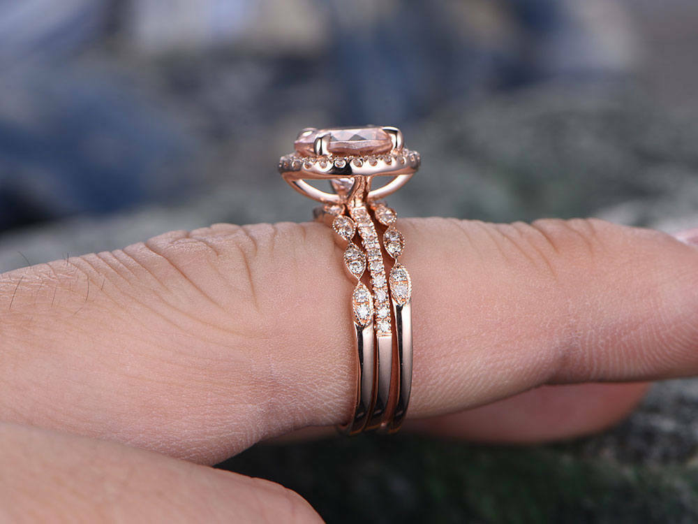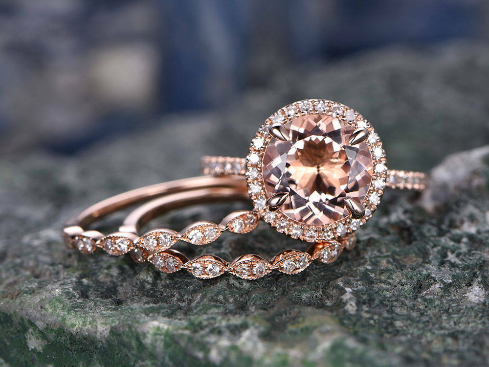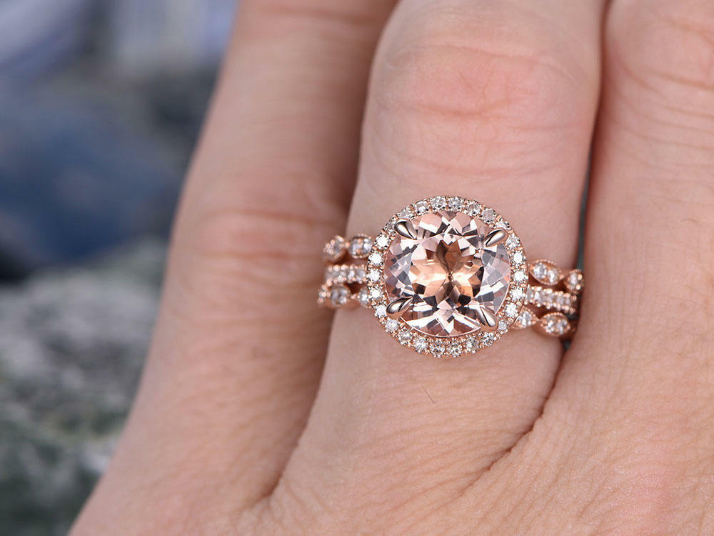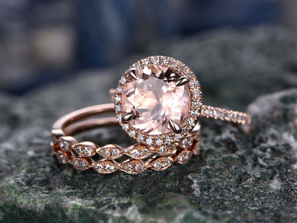 3Ct Round Cut Peach Morganite Trio Bridal Set Engagement Ring 14K Rose Gold Over