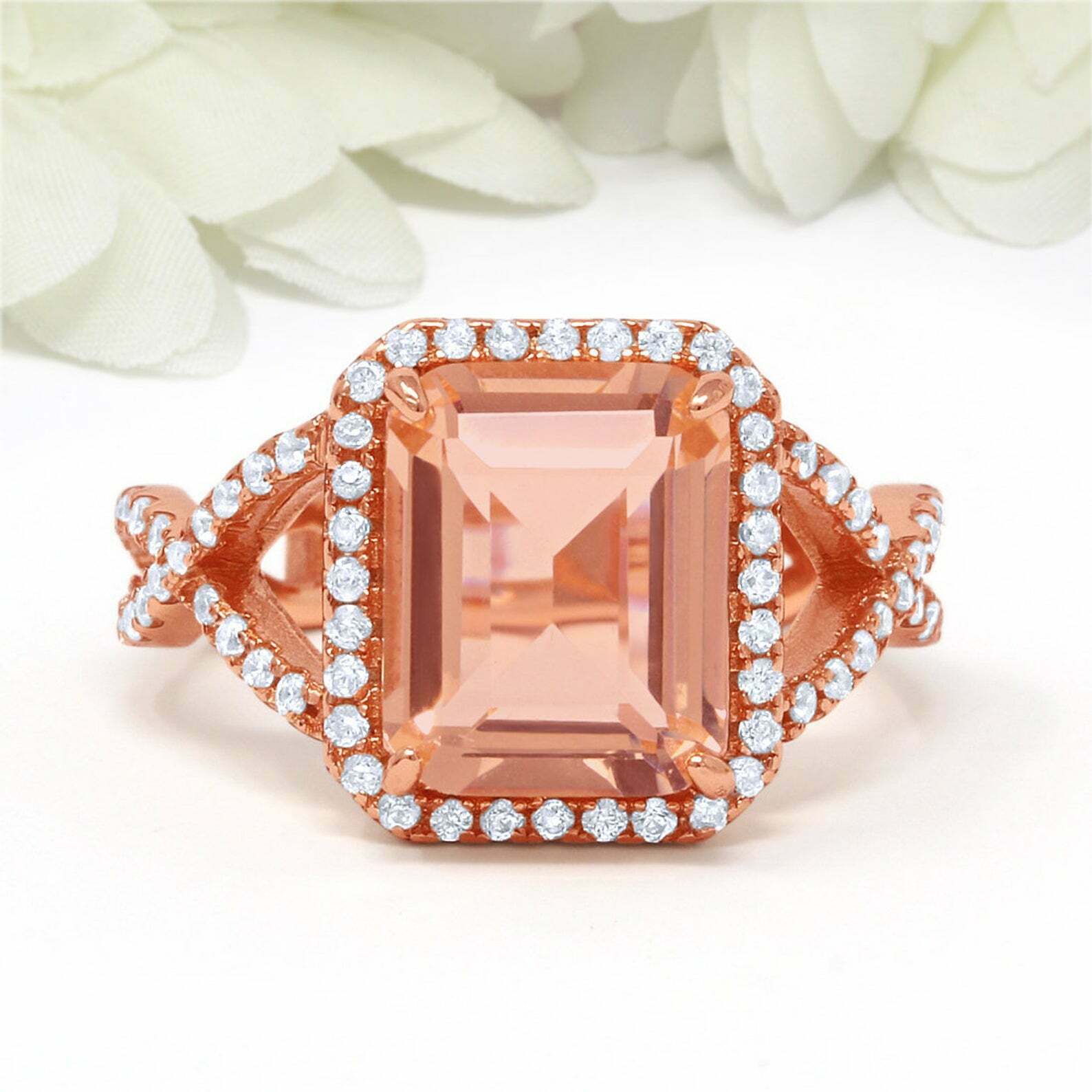 4ct Emerald Cut Peach Morganite Infinity Band Halo Engagement Ring 14k Rose Gold Finish