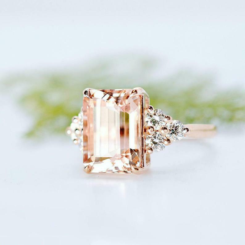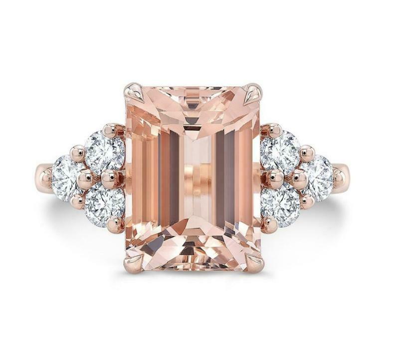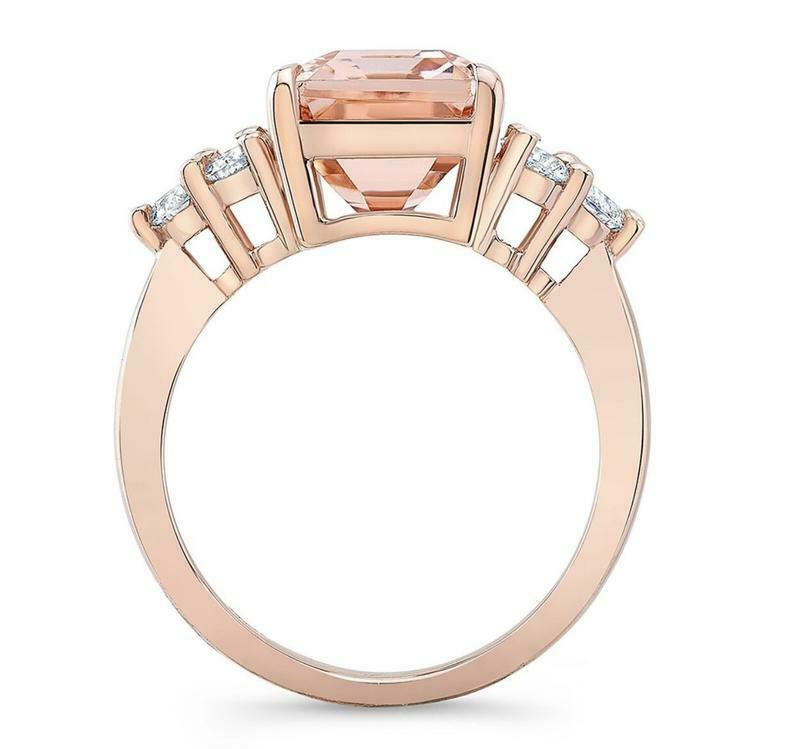 4ct Emerald Cut Peach Morganite Engagement Ring 14k Rose Gold Over Solitaire Diamond Accents
