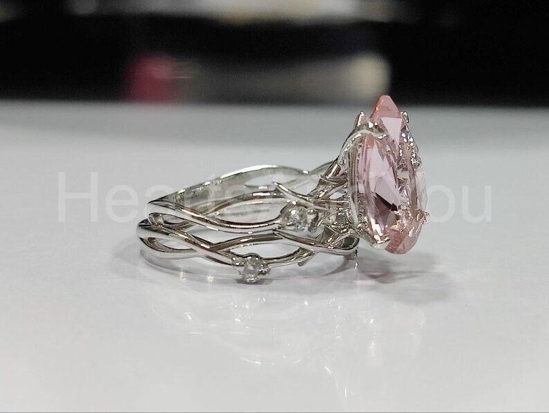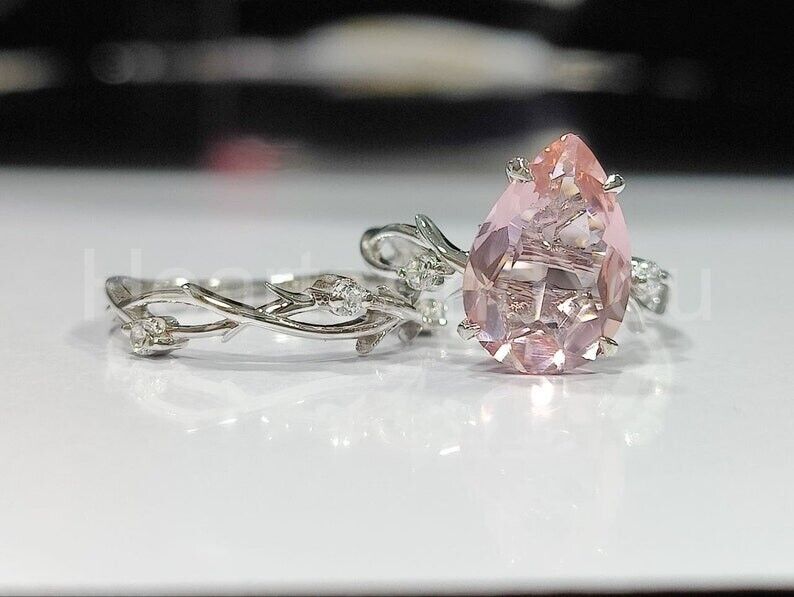 4ct Pear Cut Simulated Peach Morganite Twig Leaf Bridal Set 14k White Gold Plated
