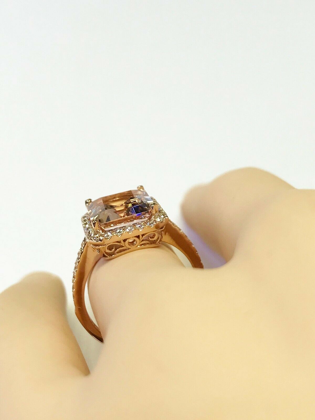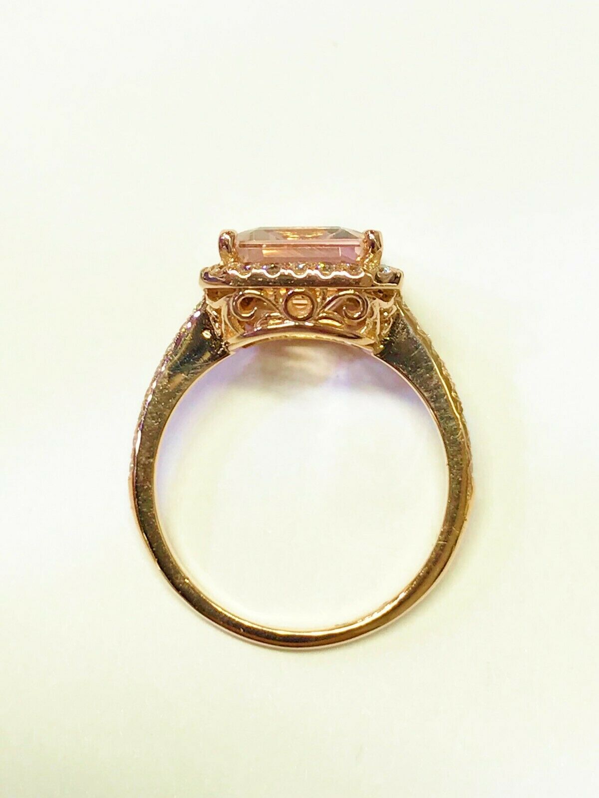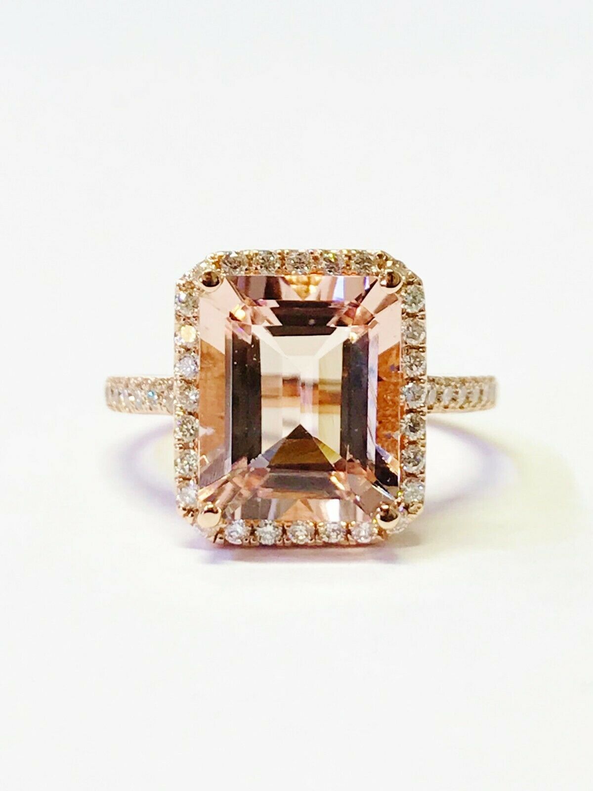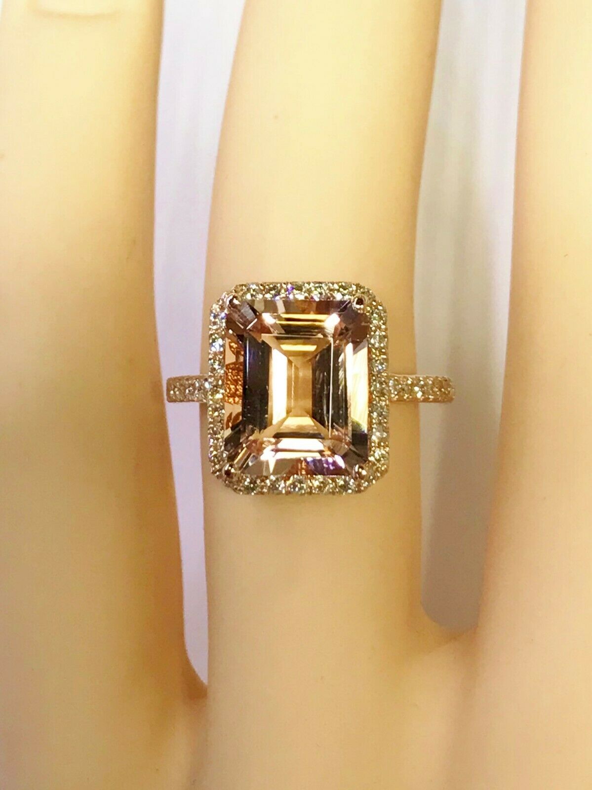 5Ct Emerald Cut Morganite Exquisite Halo Engagement Ring 14K Rose Gold Finish