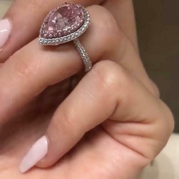 5Ct Pear Cut Peach Morganite Diamond Halo Solitaire Ring 14K White Gold Finish