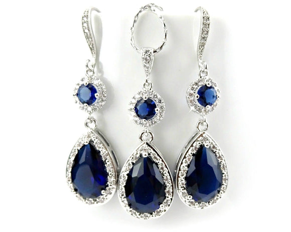 8ct Pear Blue Sapphire Halo Tear Drop Pendant Earring Combo 14k White Gold Over
