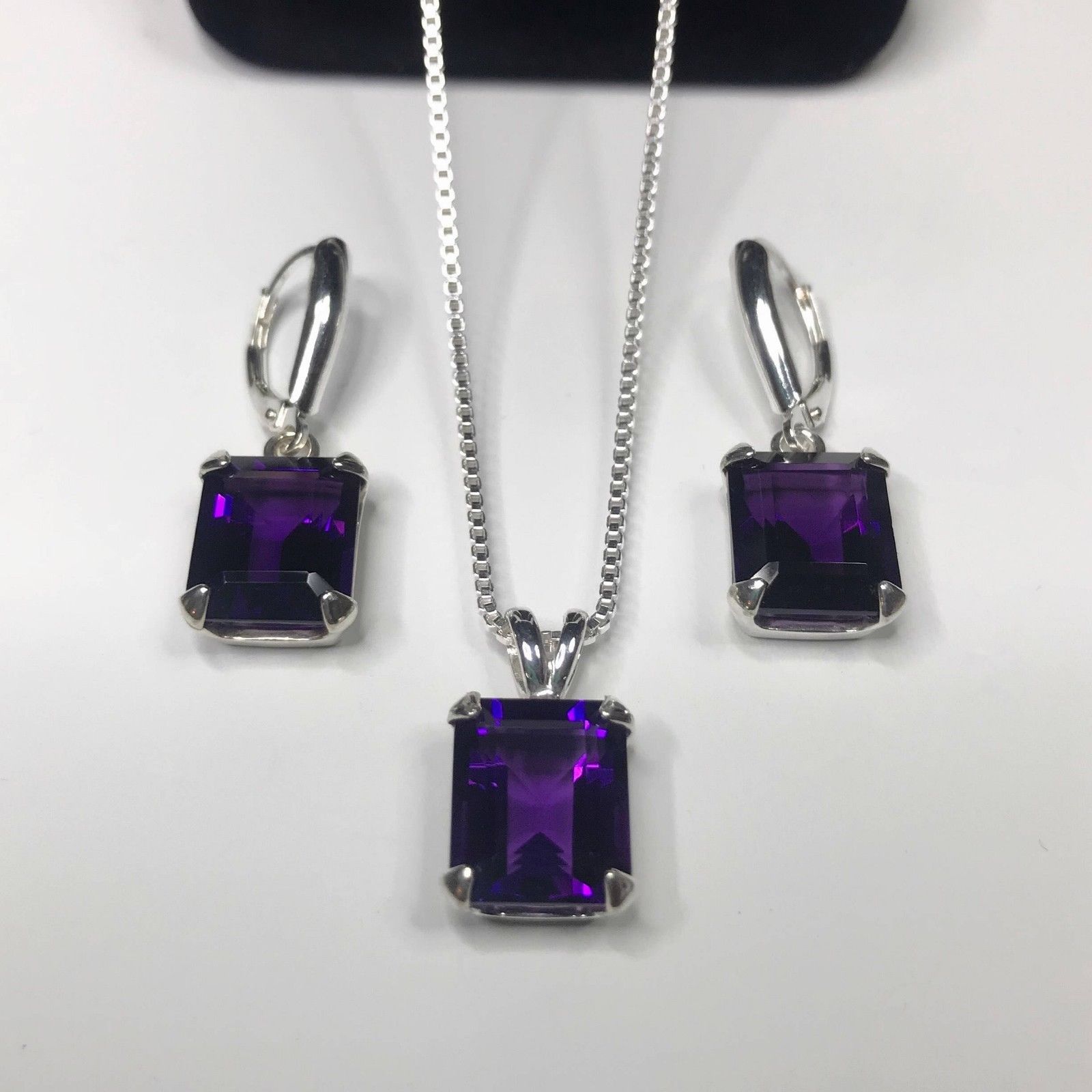 3ct Emerald Cut Purple Amethyst Drop Earring Pendant Set 14k White Gold Finish
