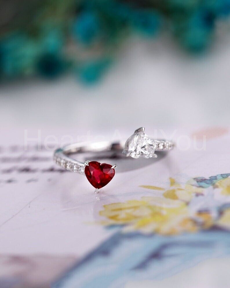 0.7ct Heart Cut Simulated Pink Ruby Unique Open Cuff Ring 14k White Gold Plated