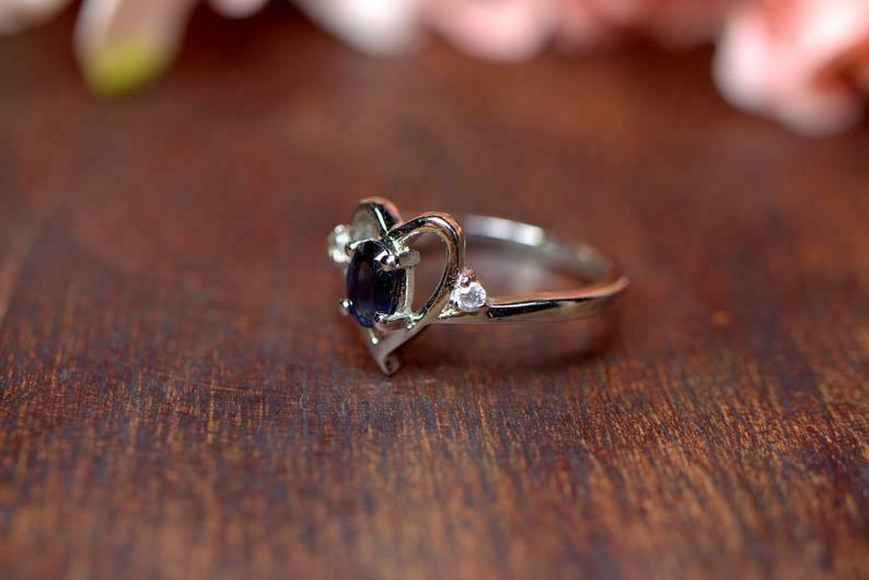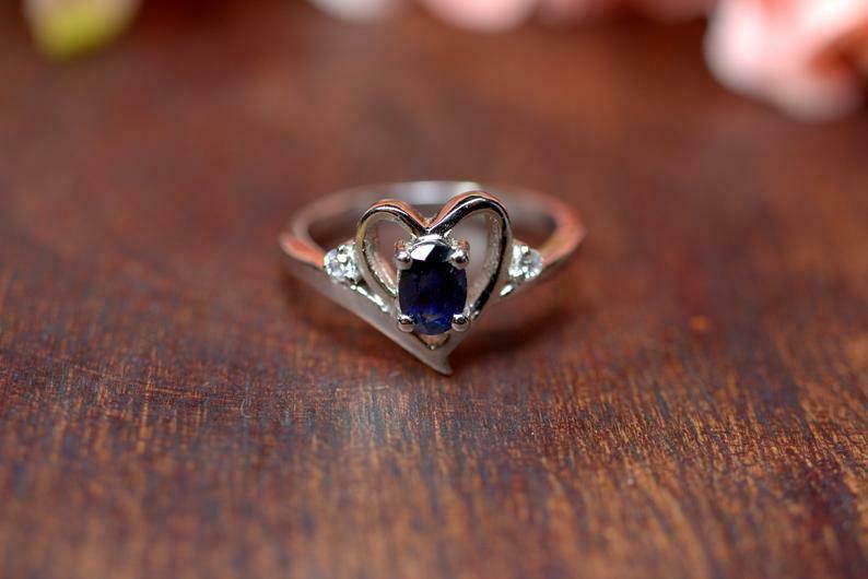 0.8ct Engagement Ring Oval Cut Blue Sapphire Heart Trilogy 14k White Gold Finish