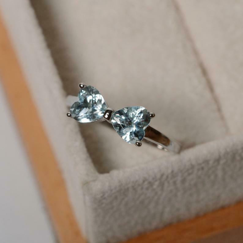 1.2ct Engagement Ring Heart Cut Blue Aquamarine Bow Knot 14k White Gold Finish