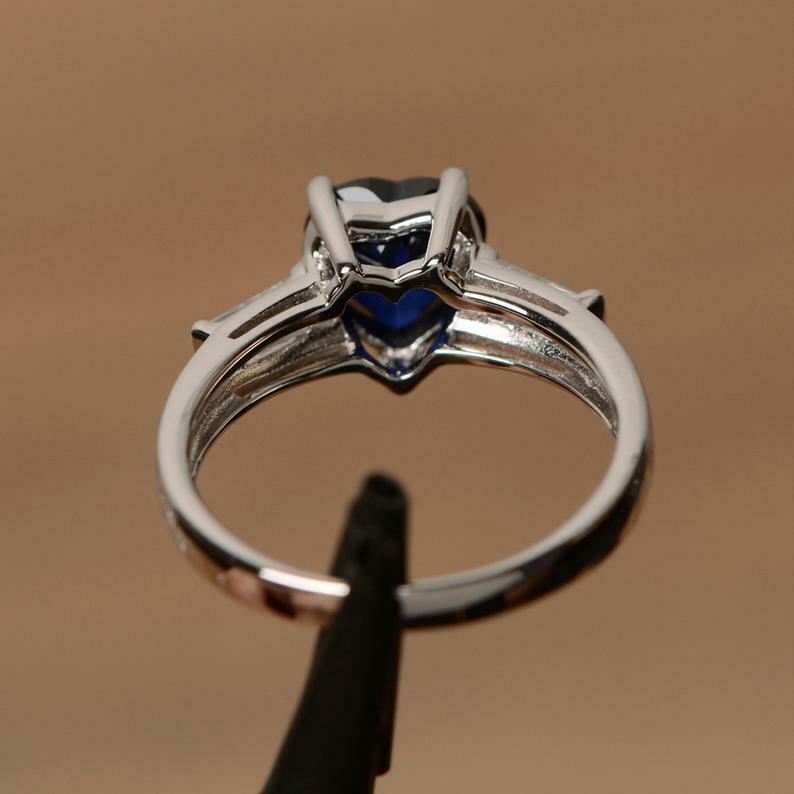 1.2ct Engagement Ring Heart Cut Blue Sapphire Three Stone 14k White Gold Finish