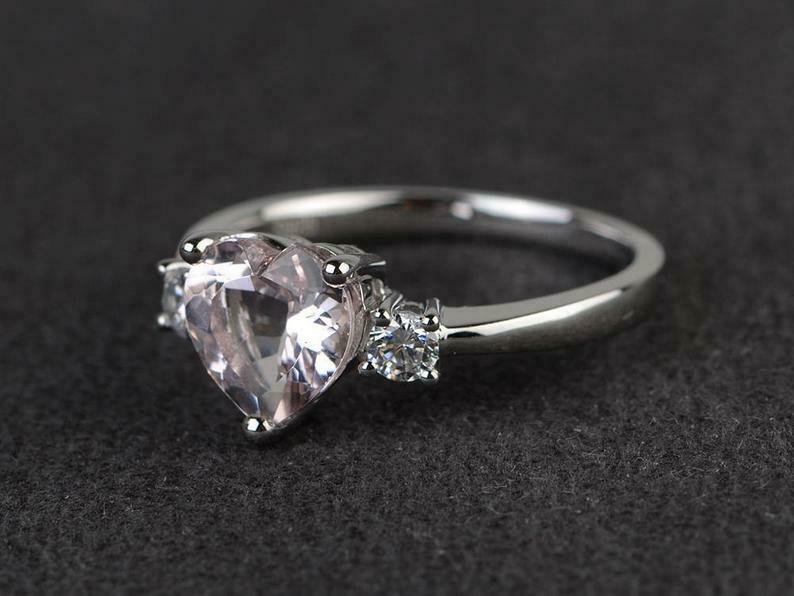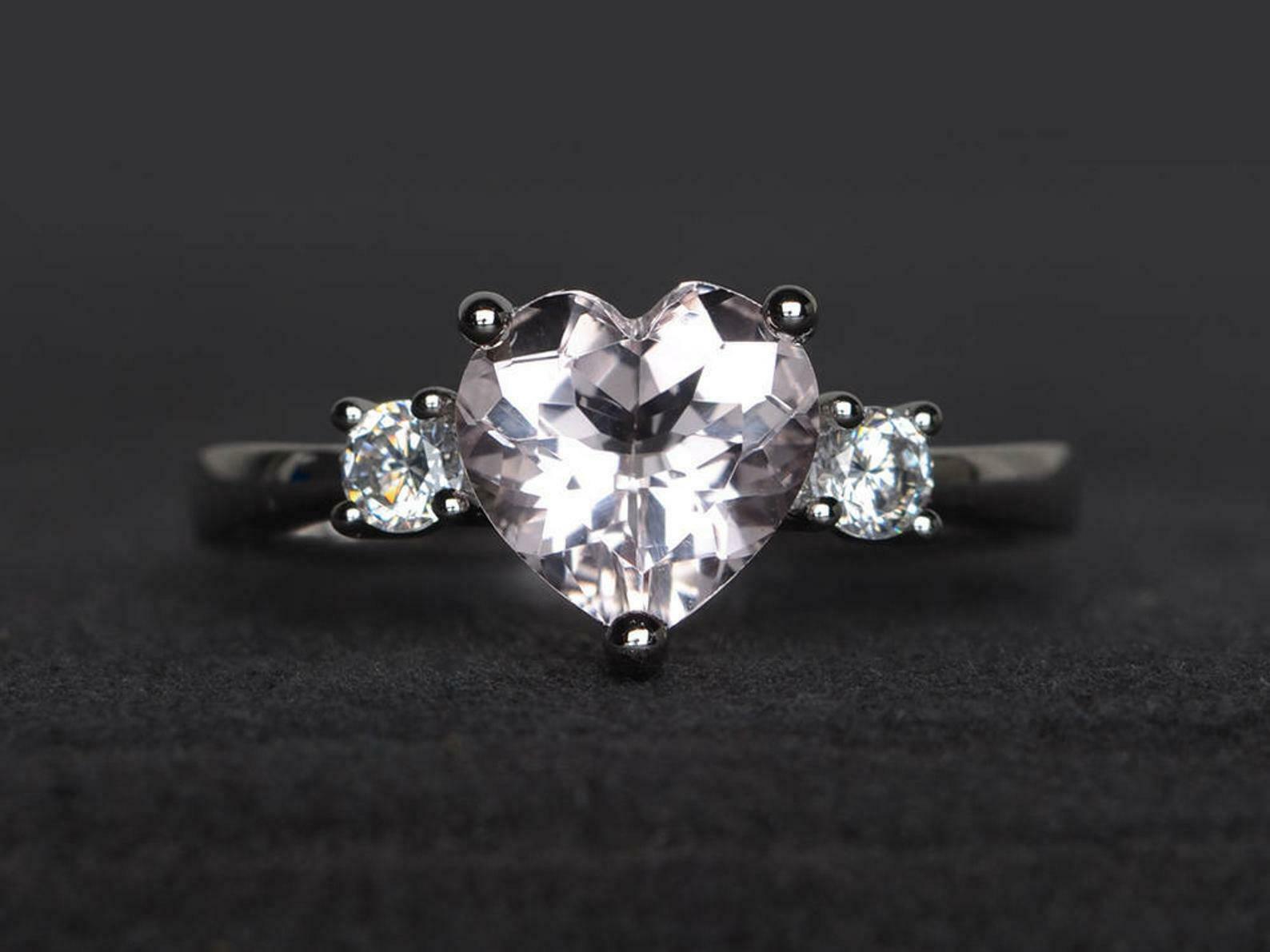 1.4ct Engagement Ring Heart Cut Peach Morganite Three Stone 14k White Gold Finish