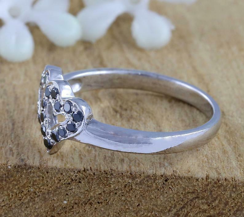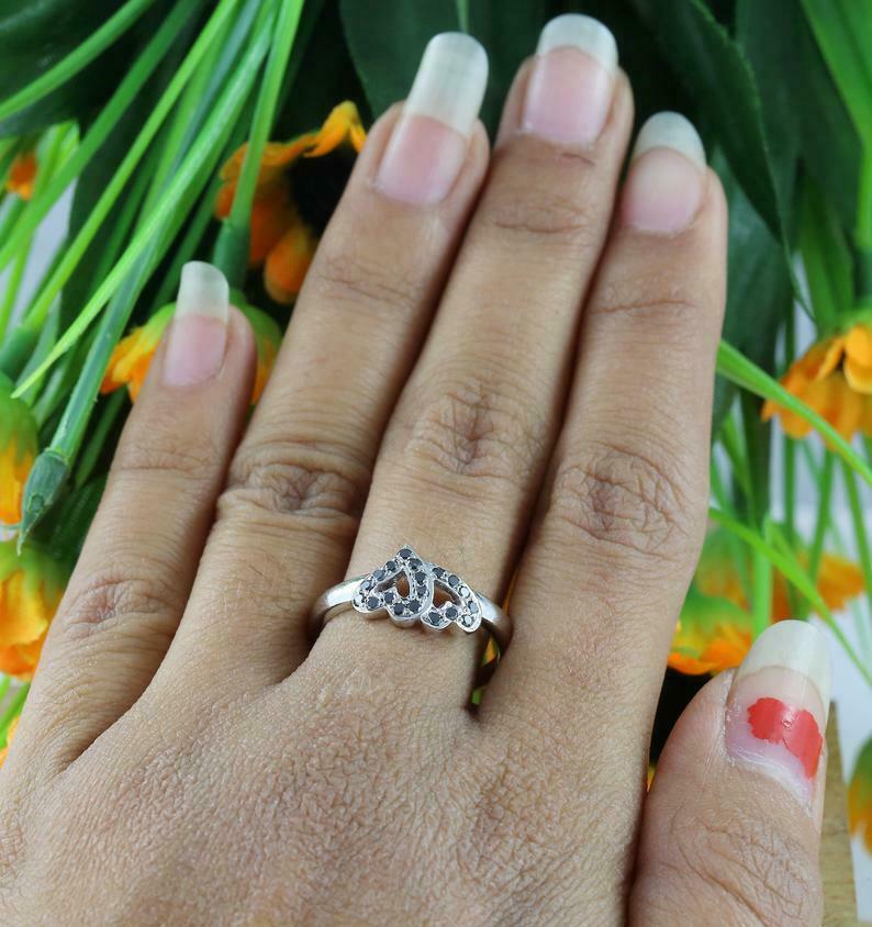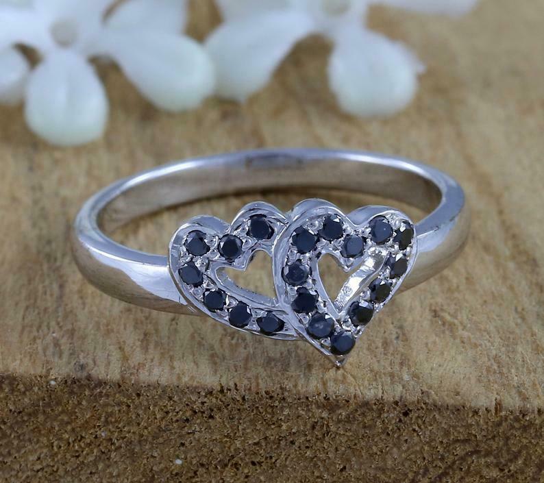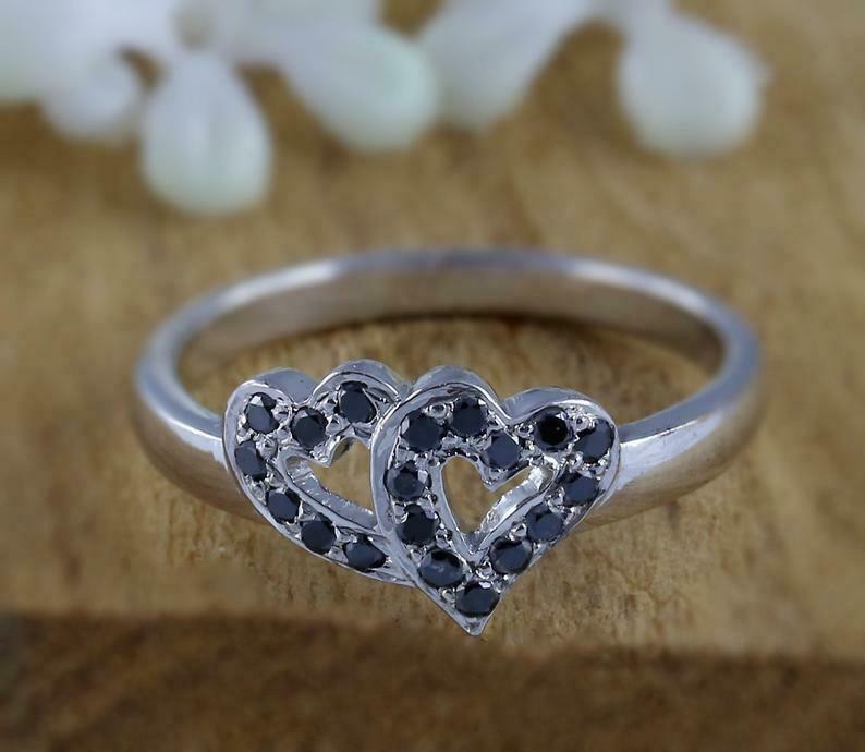 1.5ct Round Cut Black Diamond Engagement Ring Dual Heart 14k White Gold Finish