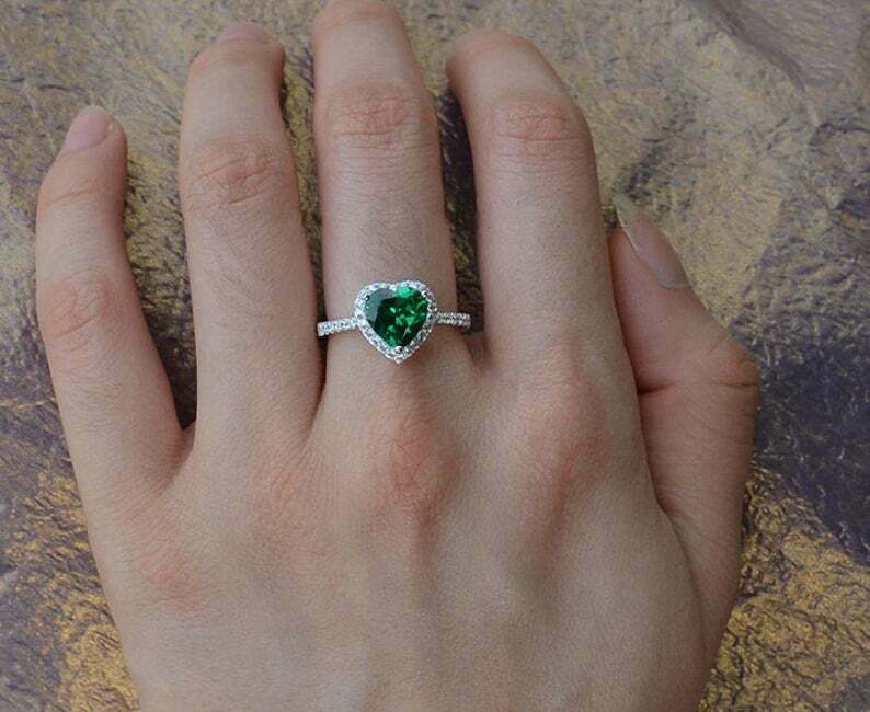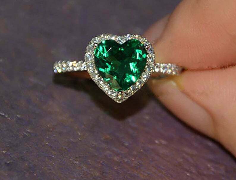 1.75ct Engagement Ring Heart Cut Green Emerald Halo 14k White Gold Finish