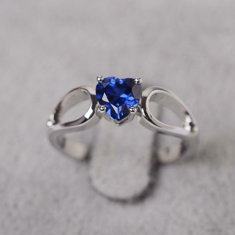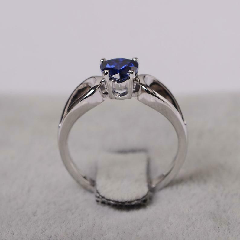 1ct Engagement Ring Heart Cut Blue Sapphire Split Shank 14k White Gold Finish