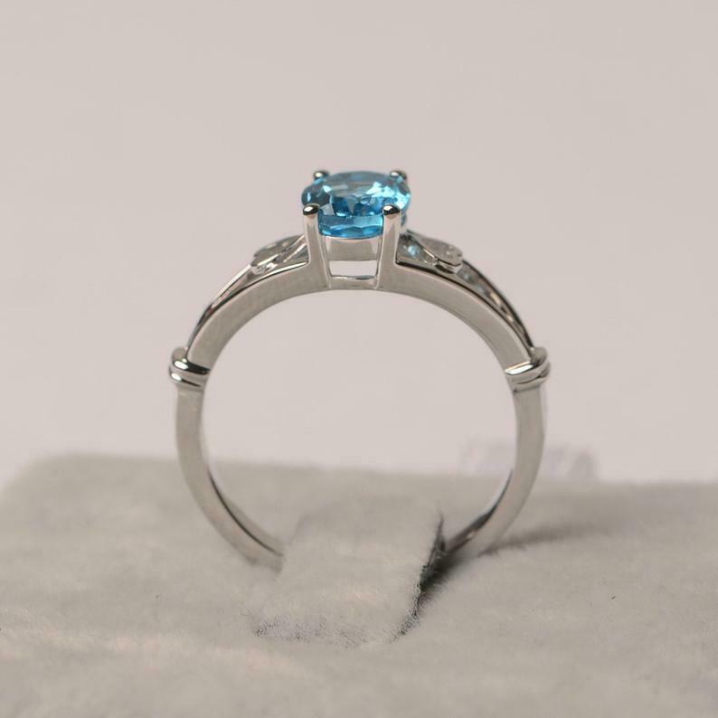 1ct Engagement Ring Oval Cut Blue Topaz Heart Split Shank 14k White Gold Finish