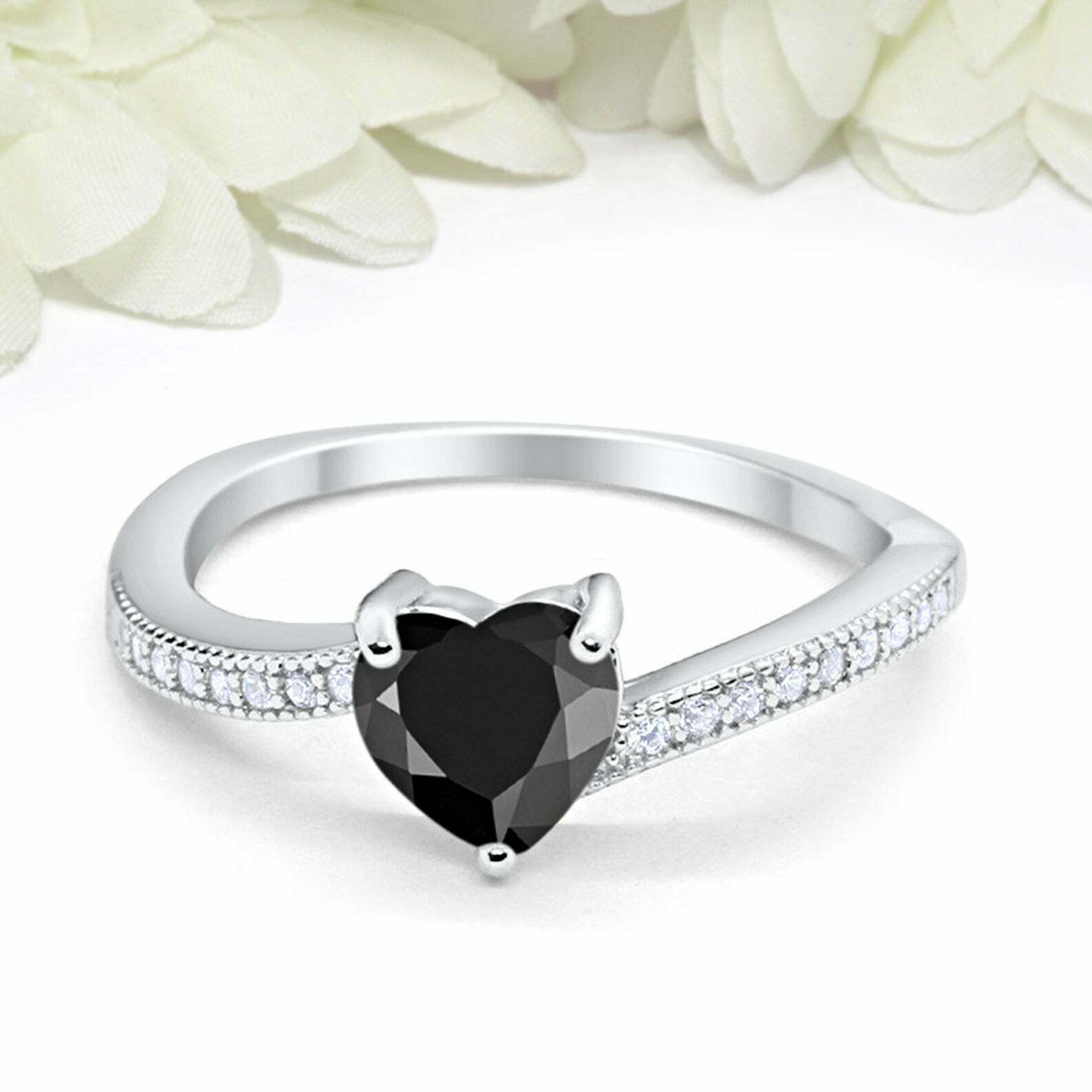 1ct Heart Cut Black Diamond Engagement Ring Swirl Round Accent 14k White Gold Finish