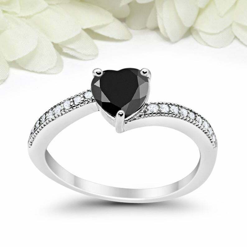 1ct Heart Black Diamond Engagement Ring Swirl Round Accent 14k White Gold Finish