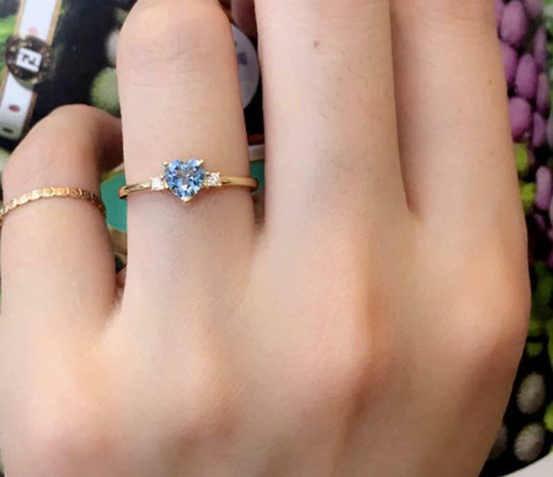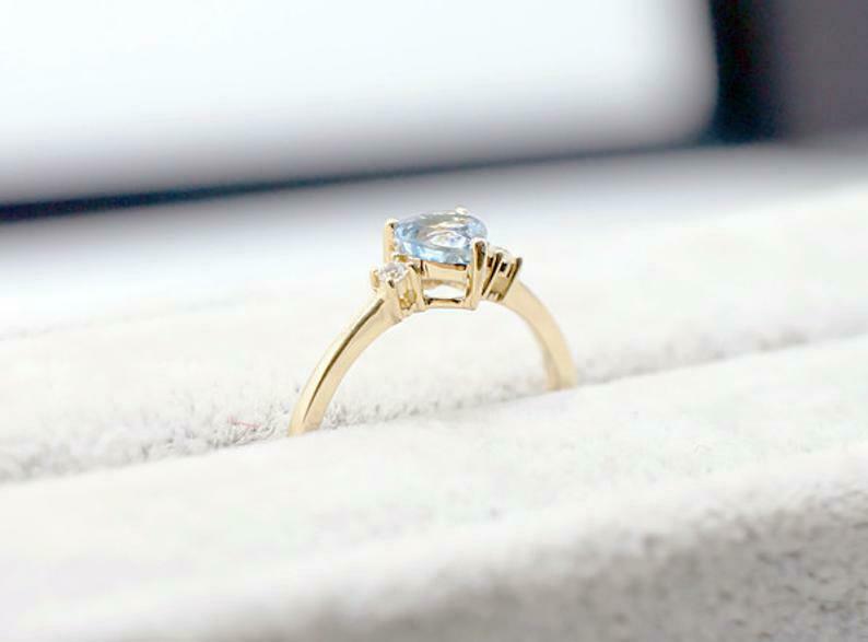 1ct Heart Blue Aquamarine Engagement Ring Minimalist Trilogy 14k YellowGold Over