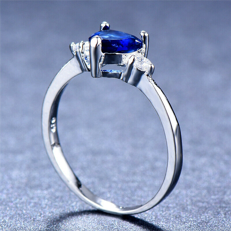 1ct Heart Cut Blue Sapphire Engagement Ring 14k WhiteGold Finish Trilogy Diamond
