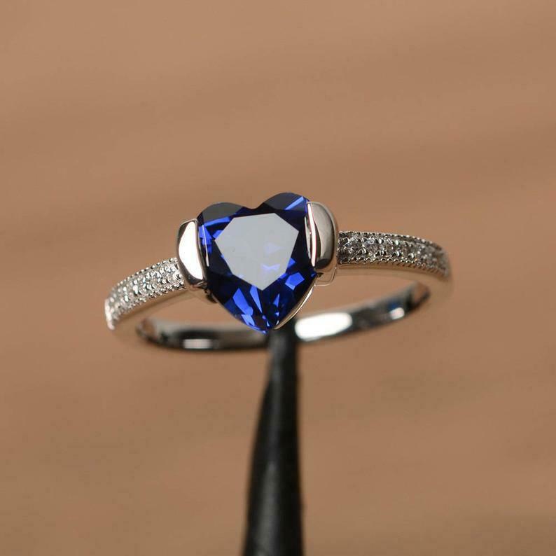 1ct Heart Cut Blue Sapphire Solitaire with Round Accent Ring 14k White Gold Over