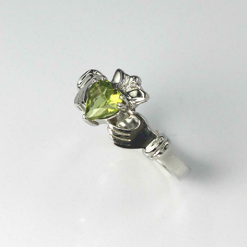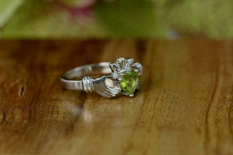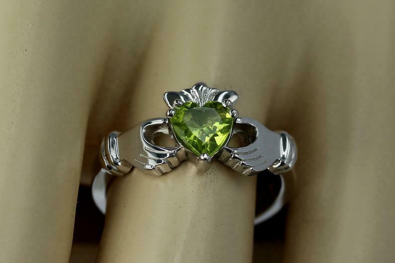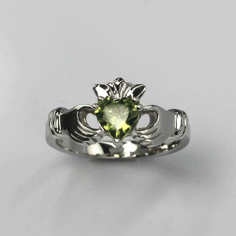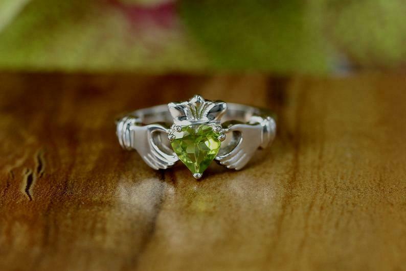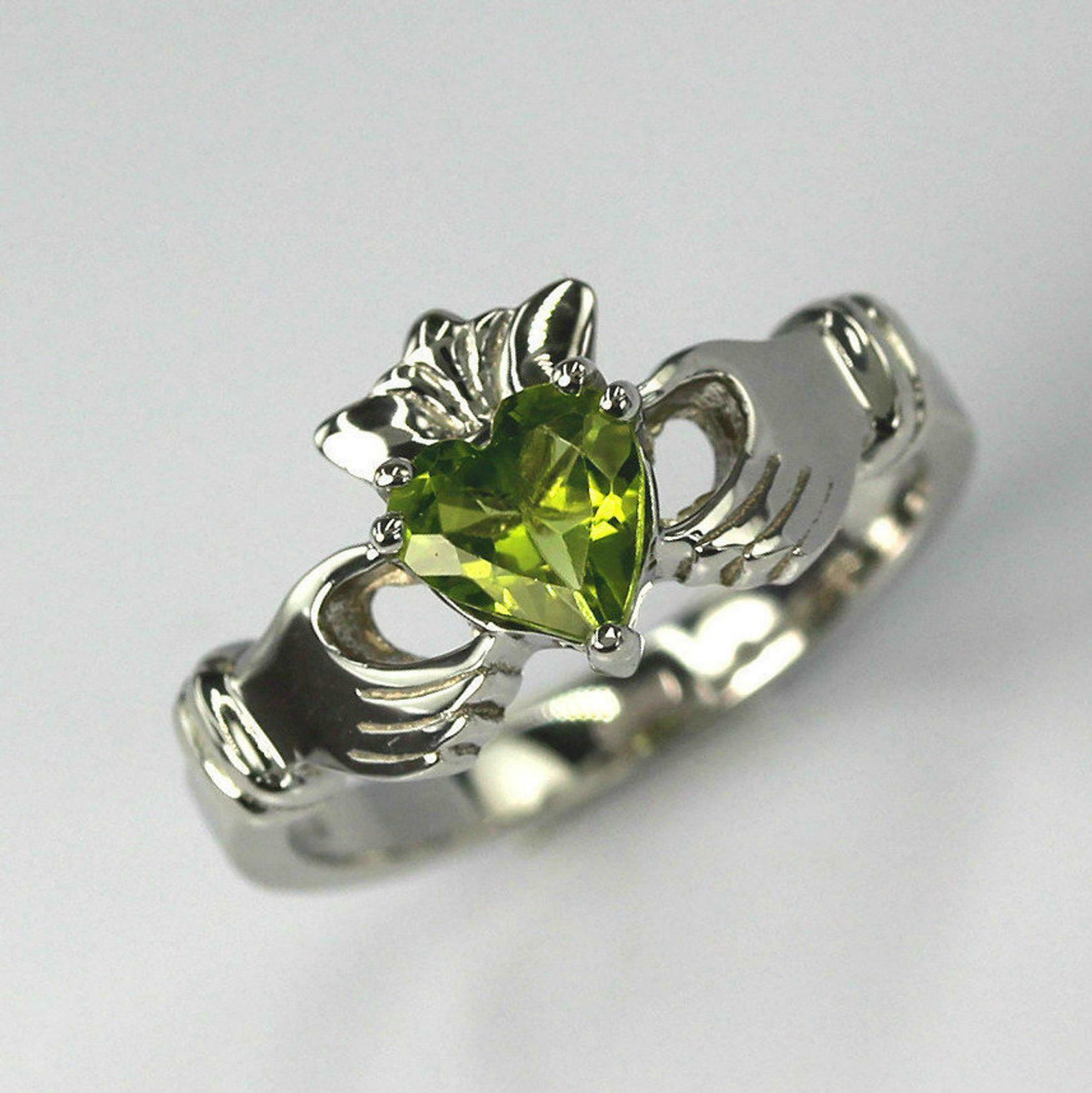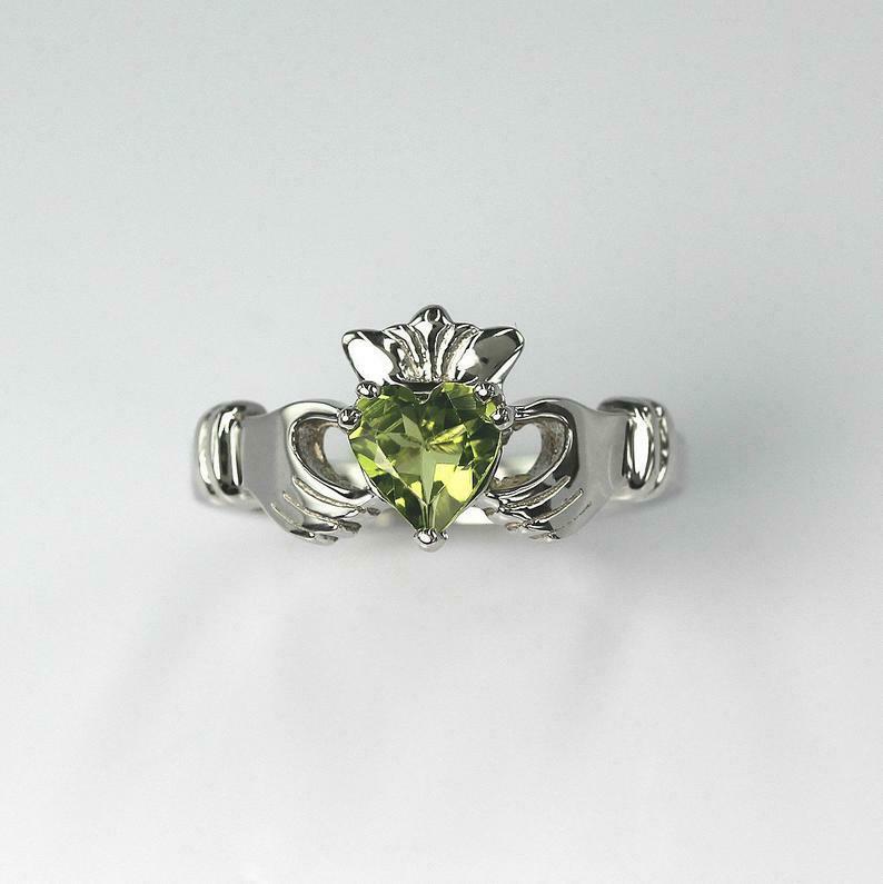 1ct Heart Cut Green Peridot Engagement Ring Claddagh Design 14k WhiteGold Finish
