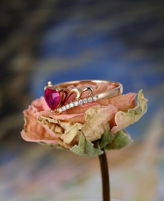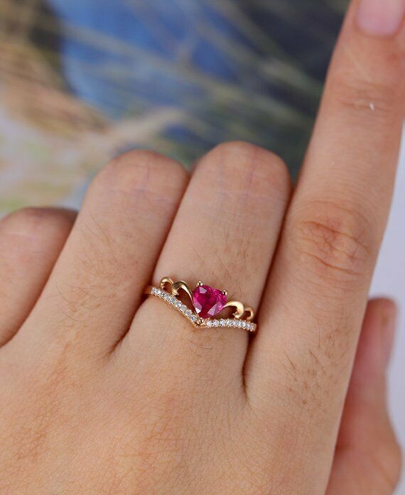 1ct Heart Cut Pink Ruby Diamond Engagement Ring 14k RoseGold Finish Crown Design