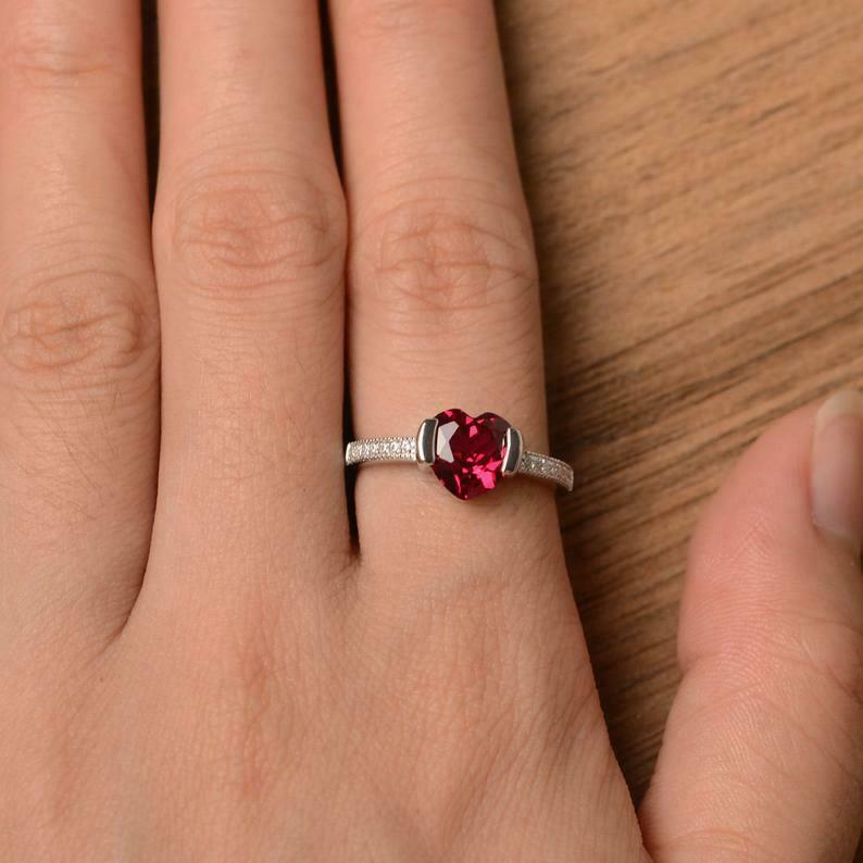 1ct Heart Cut Pink Ruby Solitaire with Round Accent Ring 14k White Gold Finish
