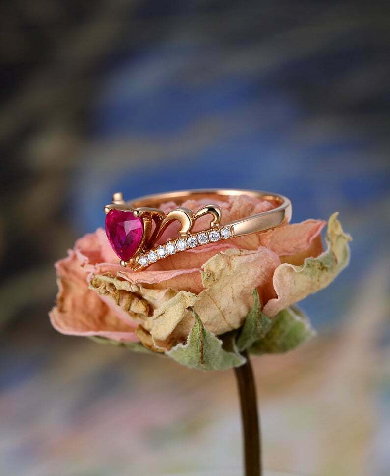 1ct Heart Cut Pink Ruby Wedding Band Ring Curved Crown 14k Yellow Gold Finish