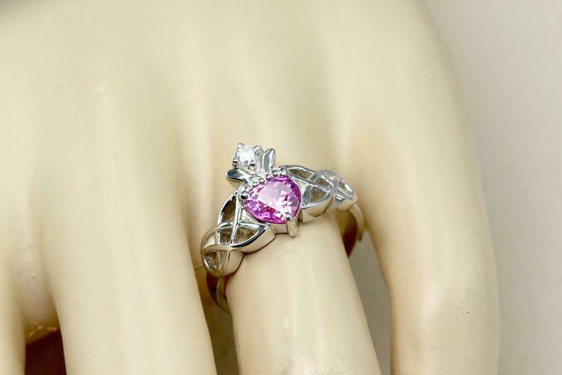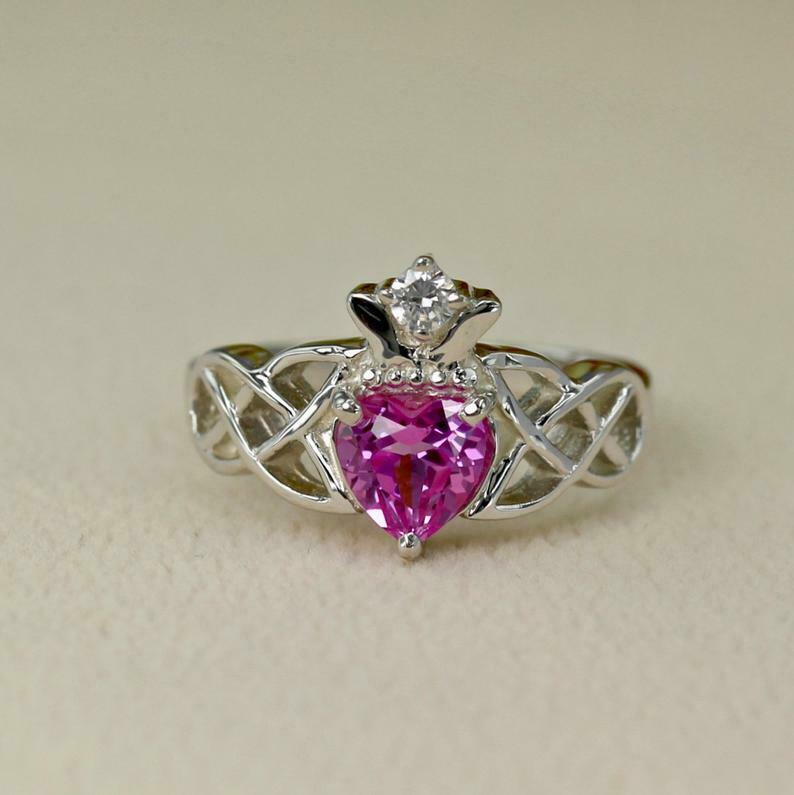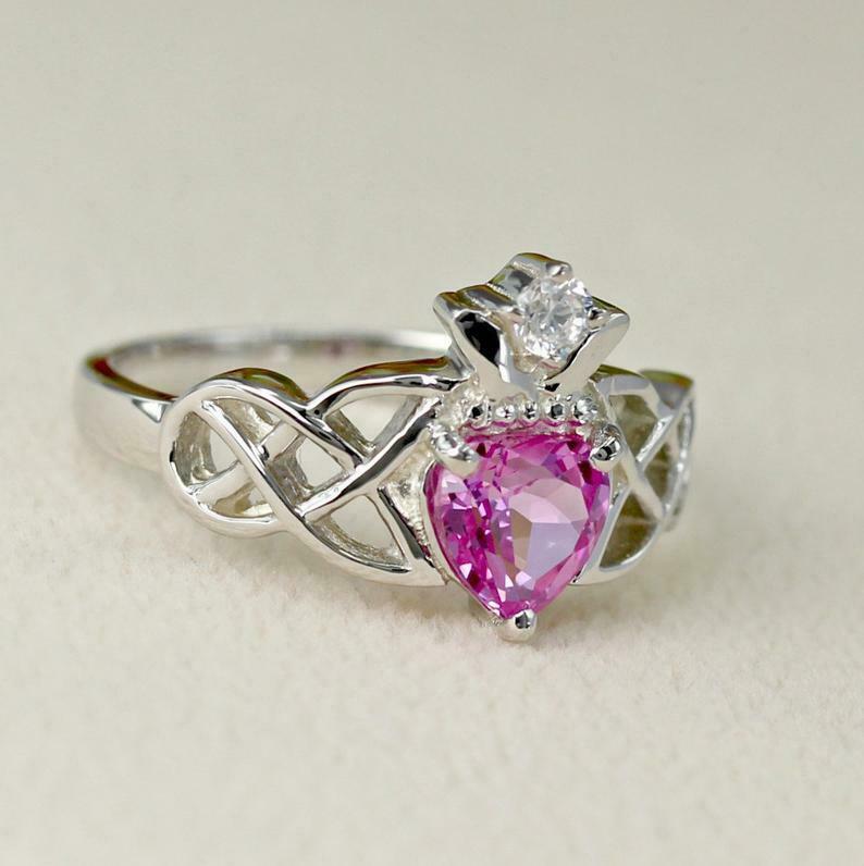 1ct Heart Cut Pink Sapphire Engagement Ring Double Knot Crown 14k White Gold Over