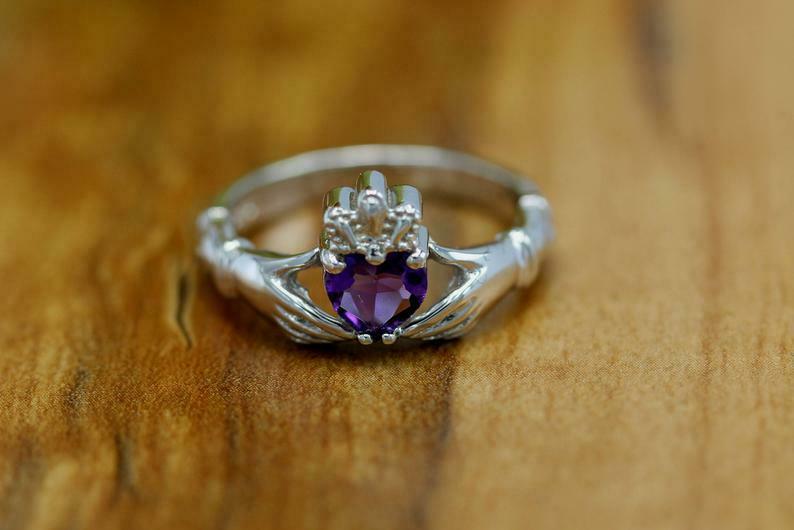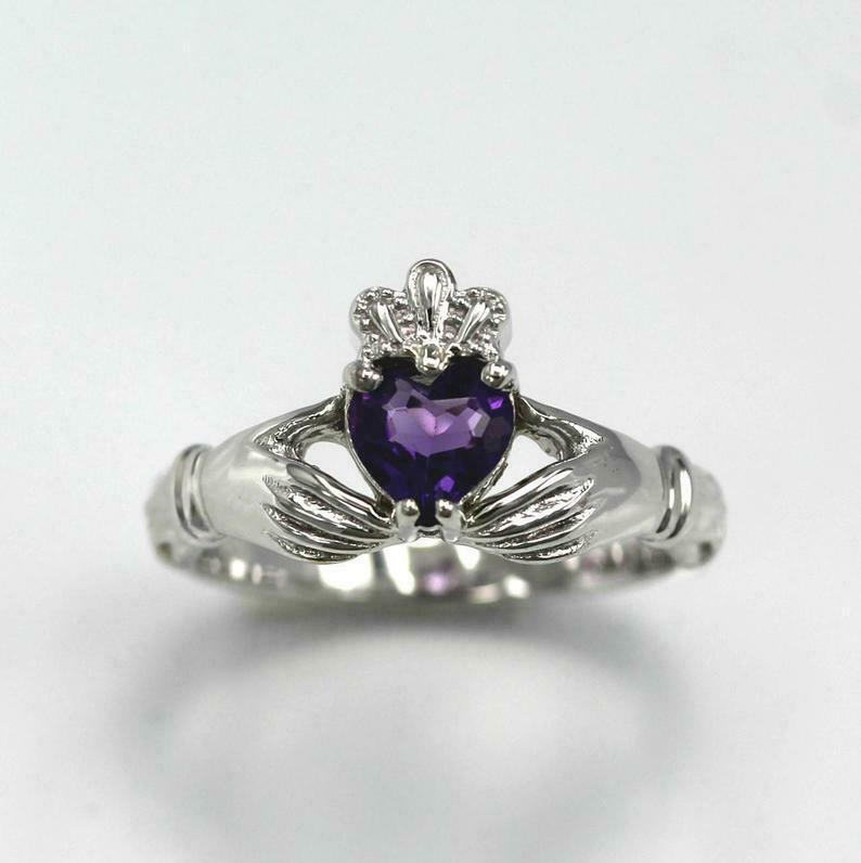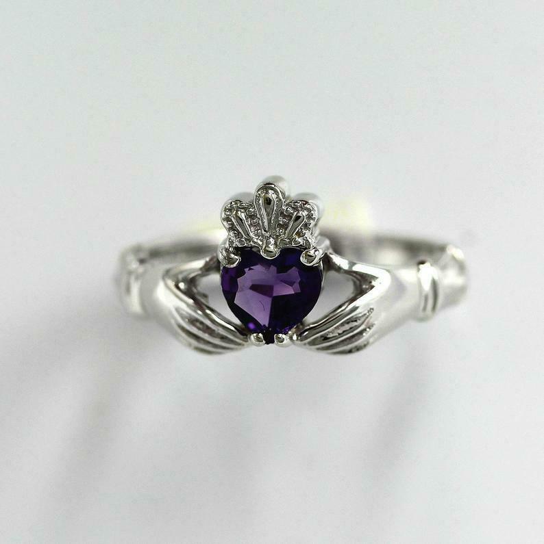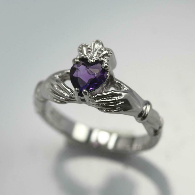1ct Heart Cut Purple Amethyst Engagement Ring Claddagh Irish 18k White Gold Over