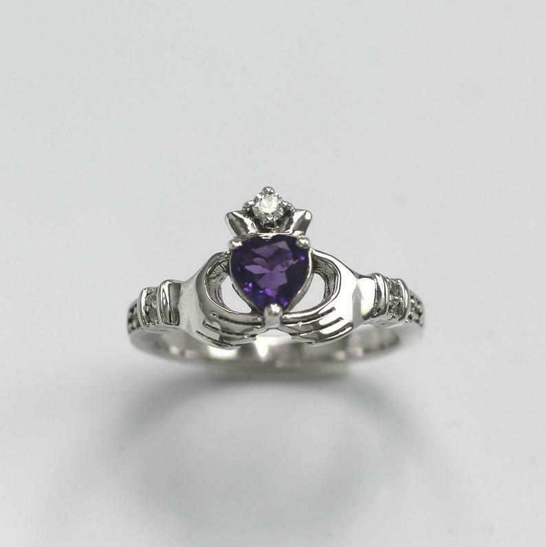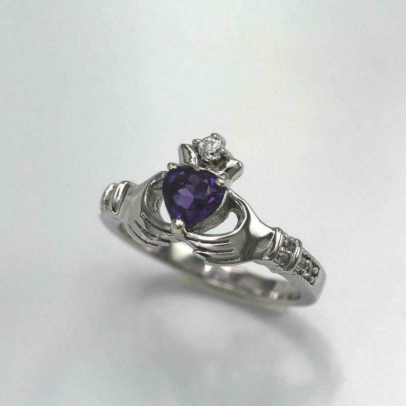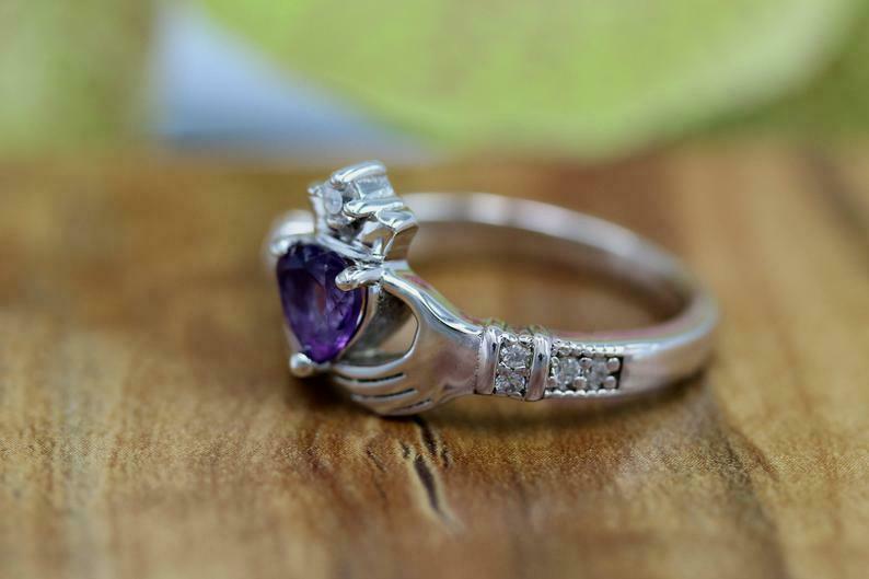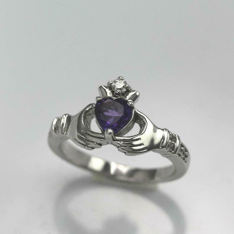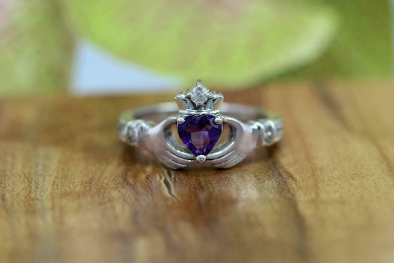 1ct Heart Purple Amethyst Engagement Ring Diamond Claddagh 14k White Gold Finish