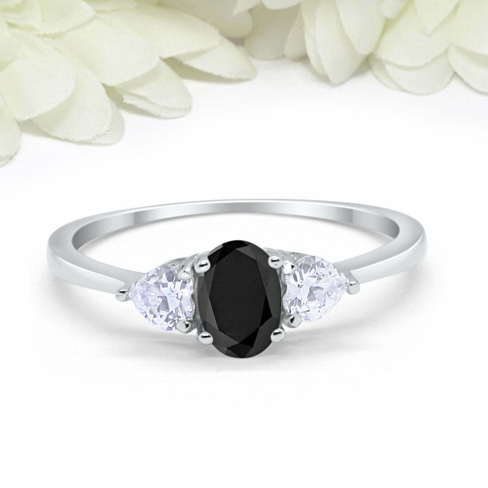 1ct Oval Cut Black Diamond Engagement Ring Heart Accents Trilogy 14k White Gold Over