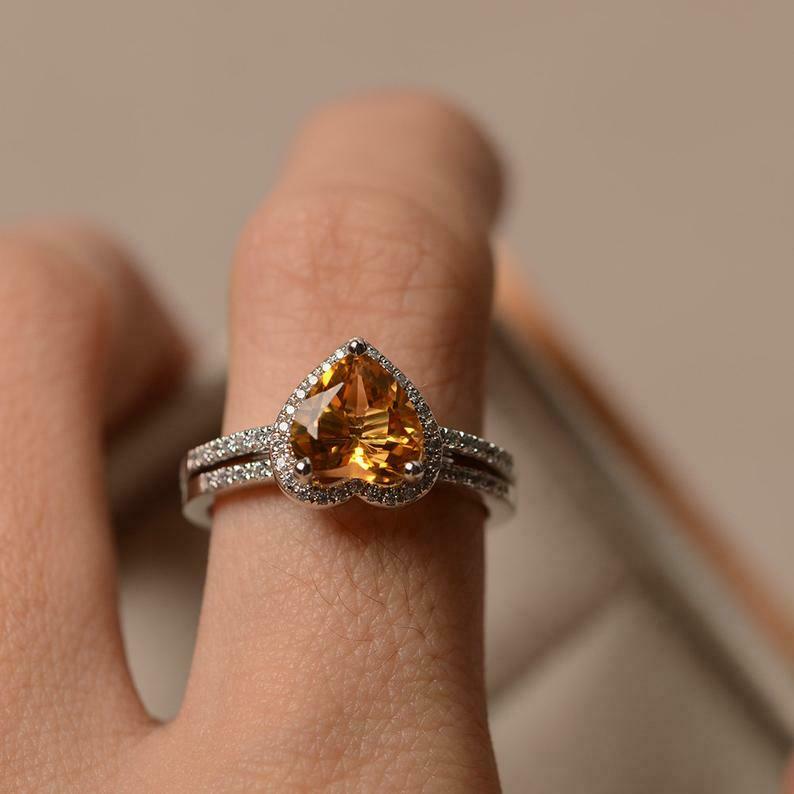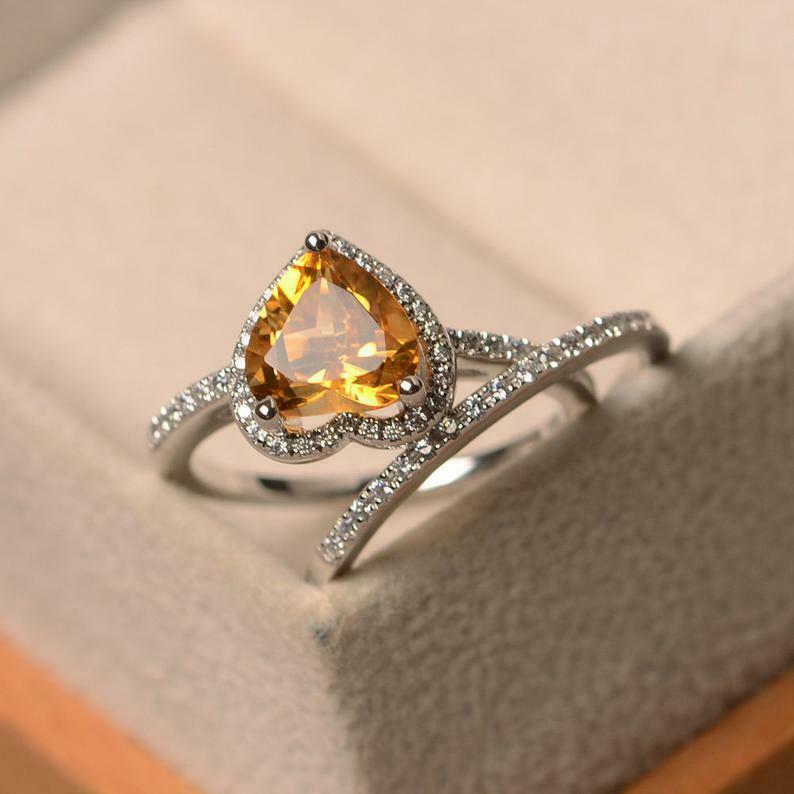 2ct Engagement Ring Heart Cut Yellow Citrine Halo Bridal Set 14k White Gold Over