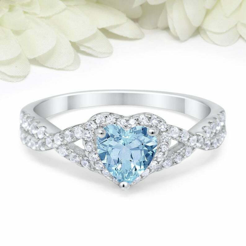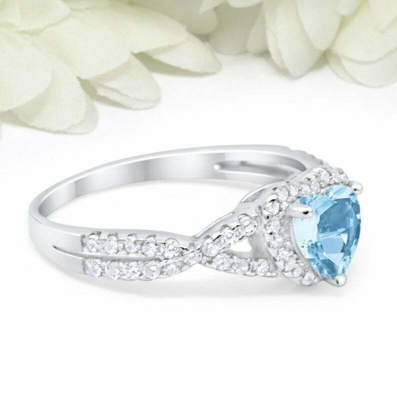 2ct Heart Blue Aquamarine Engagement Ring Split Shank Halo 14k White Gold Finish