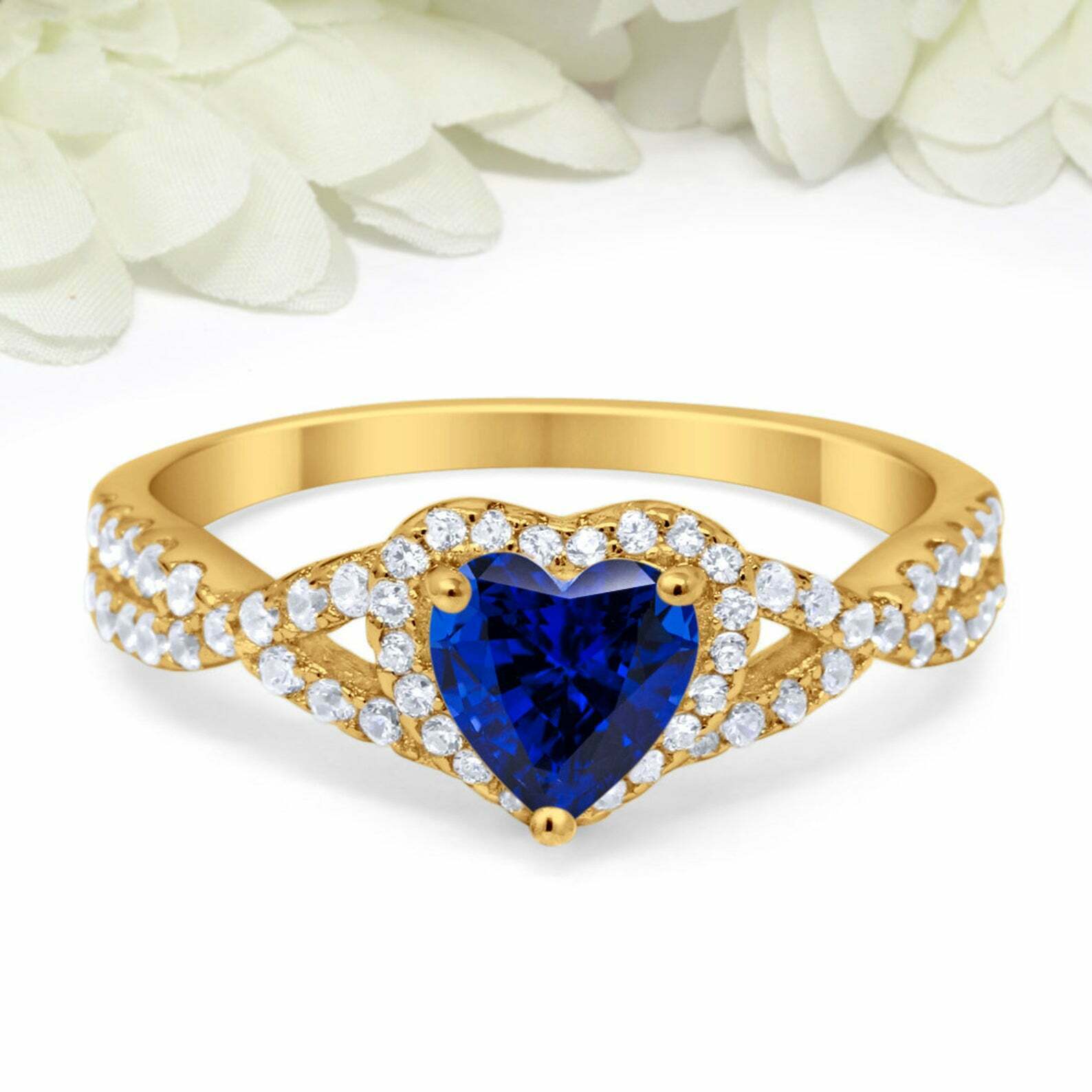 2ct Heart Cut Blue Sapphire Engagement Ring Split Shank Halo 14k YellowGold Over