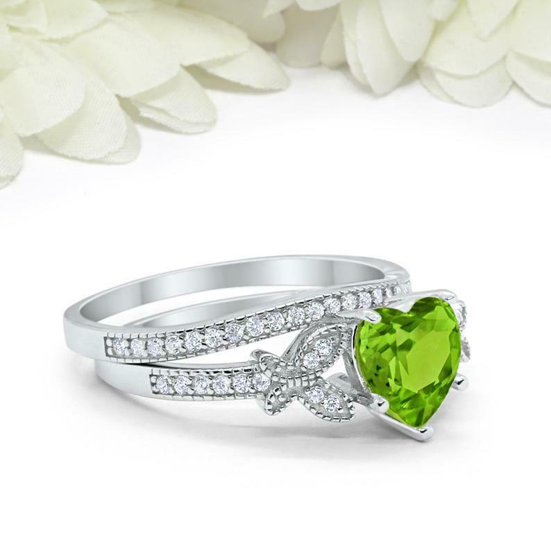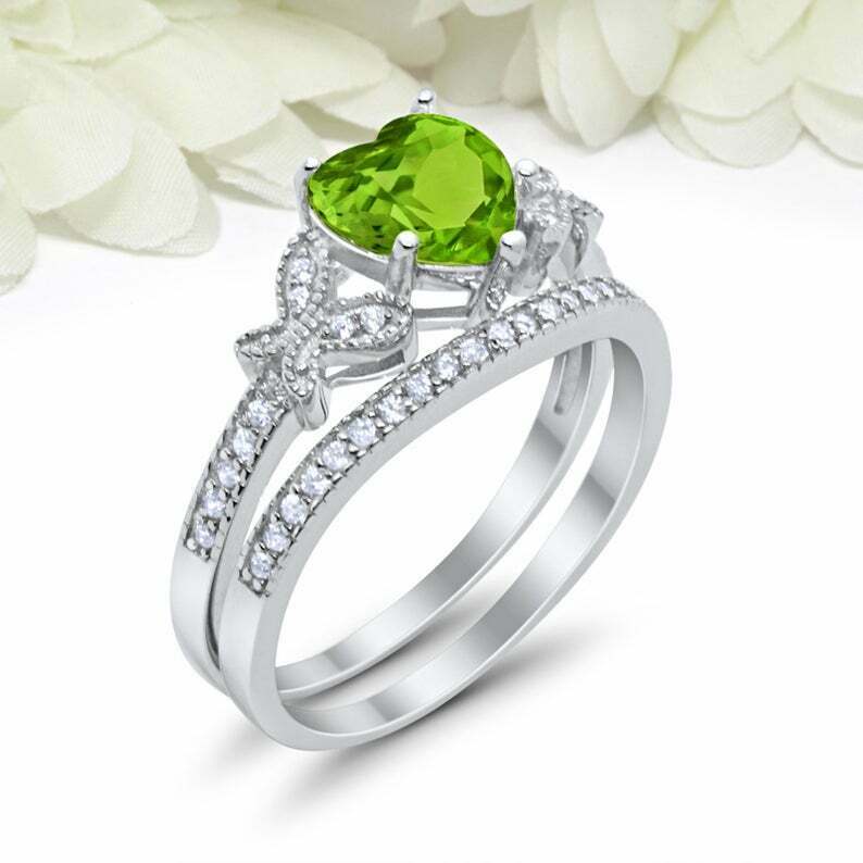 2ct Heart Cut Green Peridot Butterfly Accent Bridal Set Ring 14k White Gold Over
