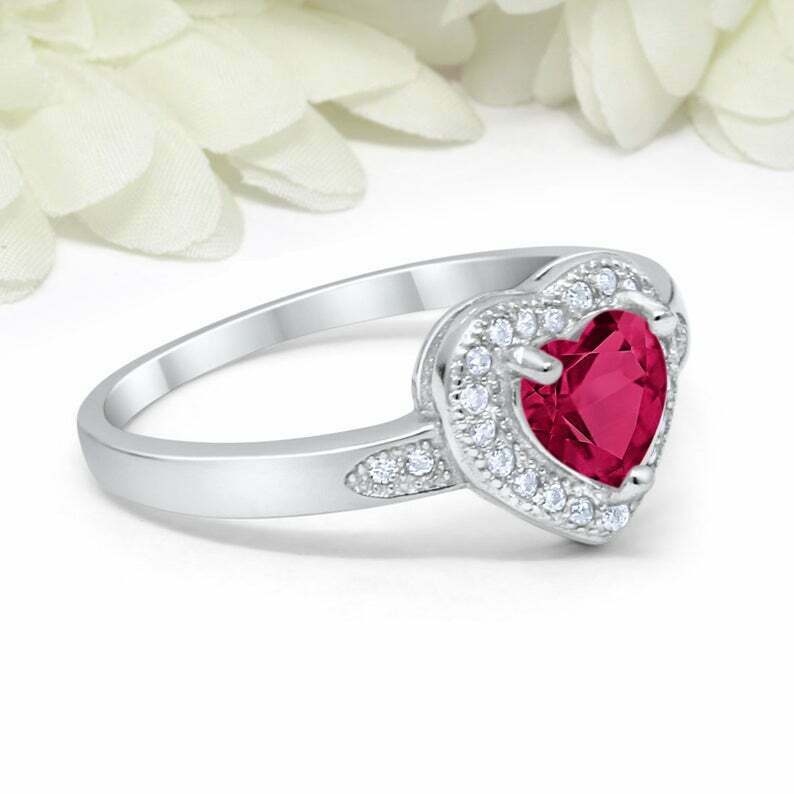 2ct Heart Cut Pink Ruby Engagement Ring Milgrain Halo 14k White Gold Finish