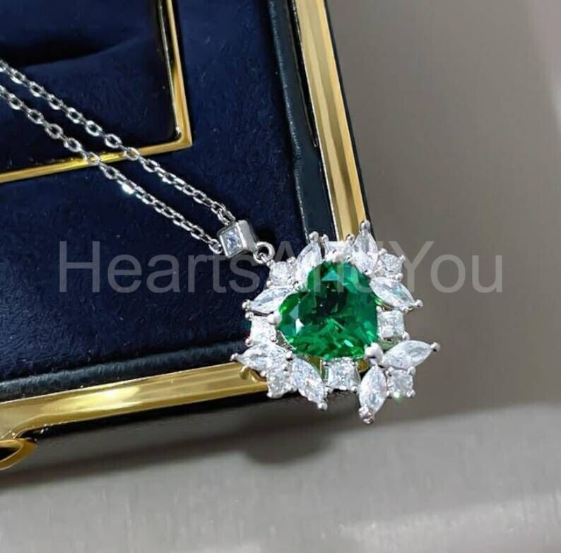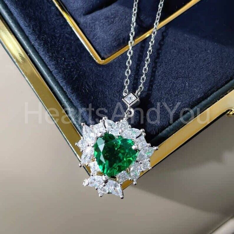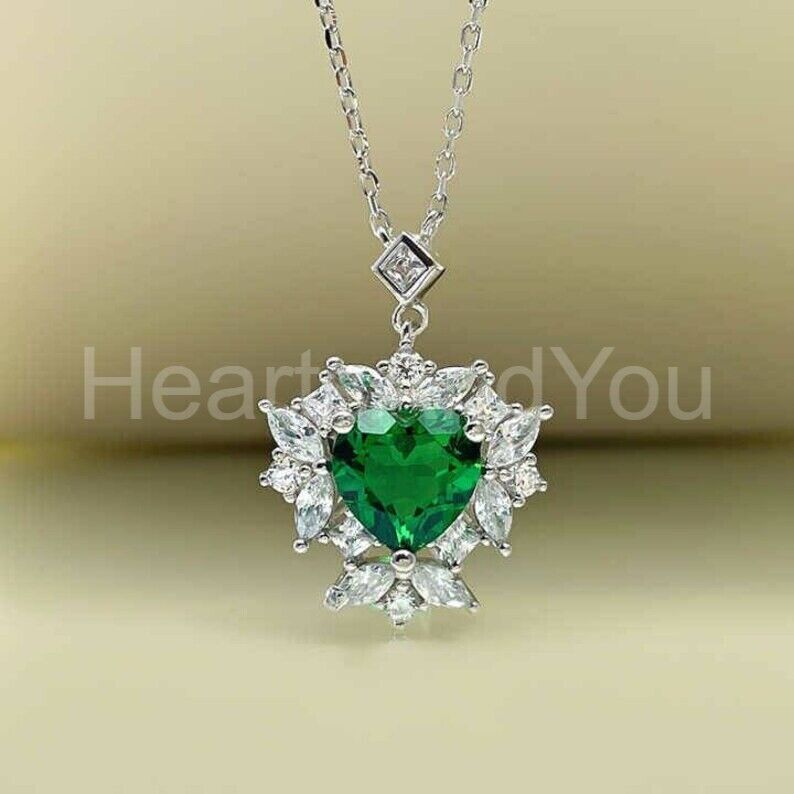 2ct Heart Cut Simulated Green Emerald Cluster Halo Pendant Chain 14k White Gold Plated
