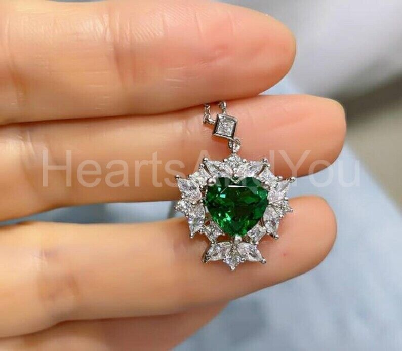 2ct Heart Cut Simulated Emerald Cluster Halo Pendant Chain 14k White Gold Plated