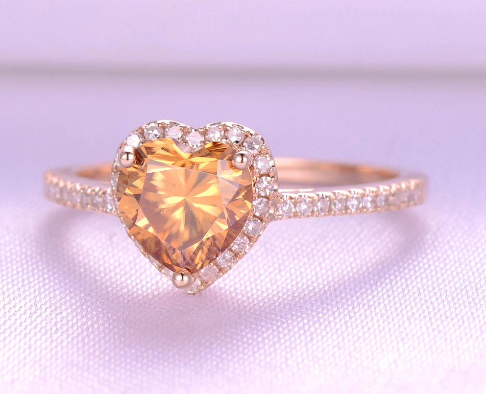 2ct Heart Cut Yellow Citrine Engagement Ring Halo Diamond 14k Rose Gold Finish