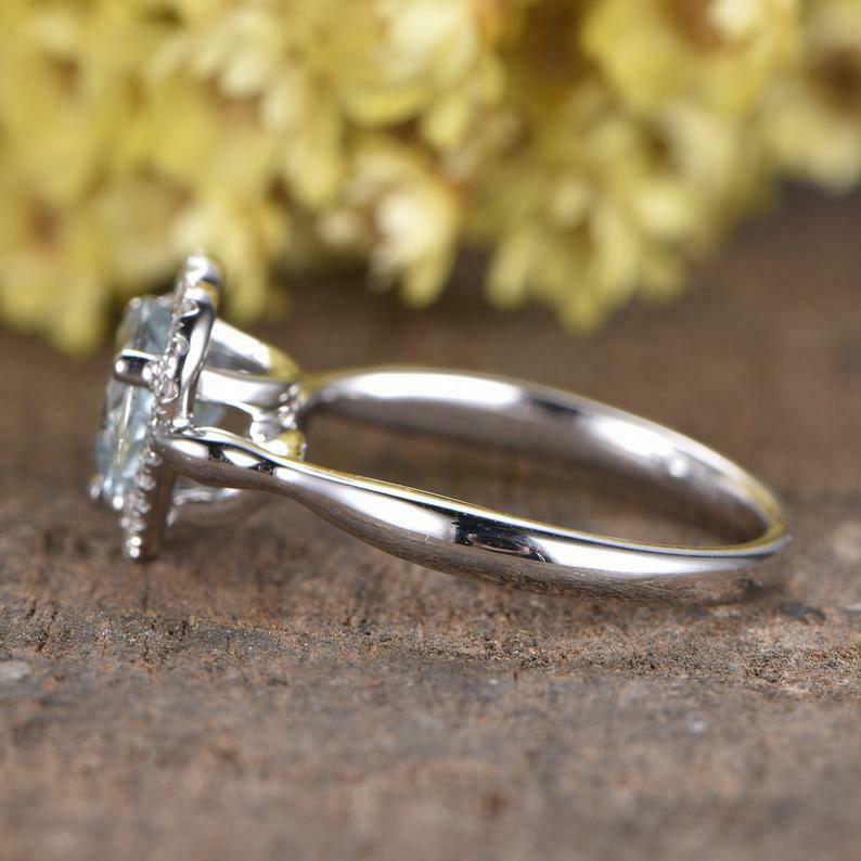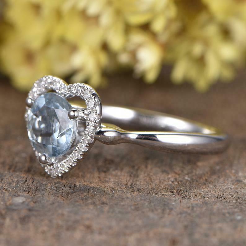 2ct Round Cut Aquamarine Engagement Ring Heart Shape Halo 14k White Gold Finish