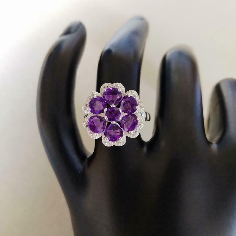 4.5ct Heart Cut Purple Amethyst Hearts Flower Cocktail Ring 14k WhiteGold Finish