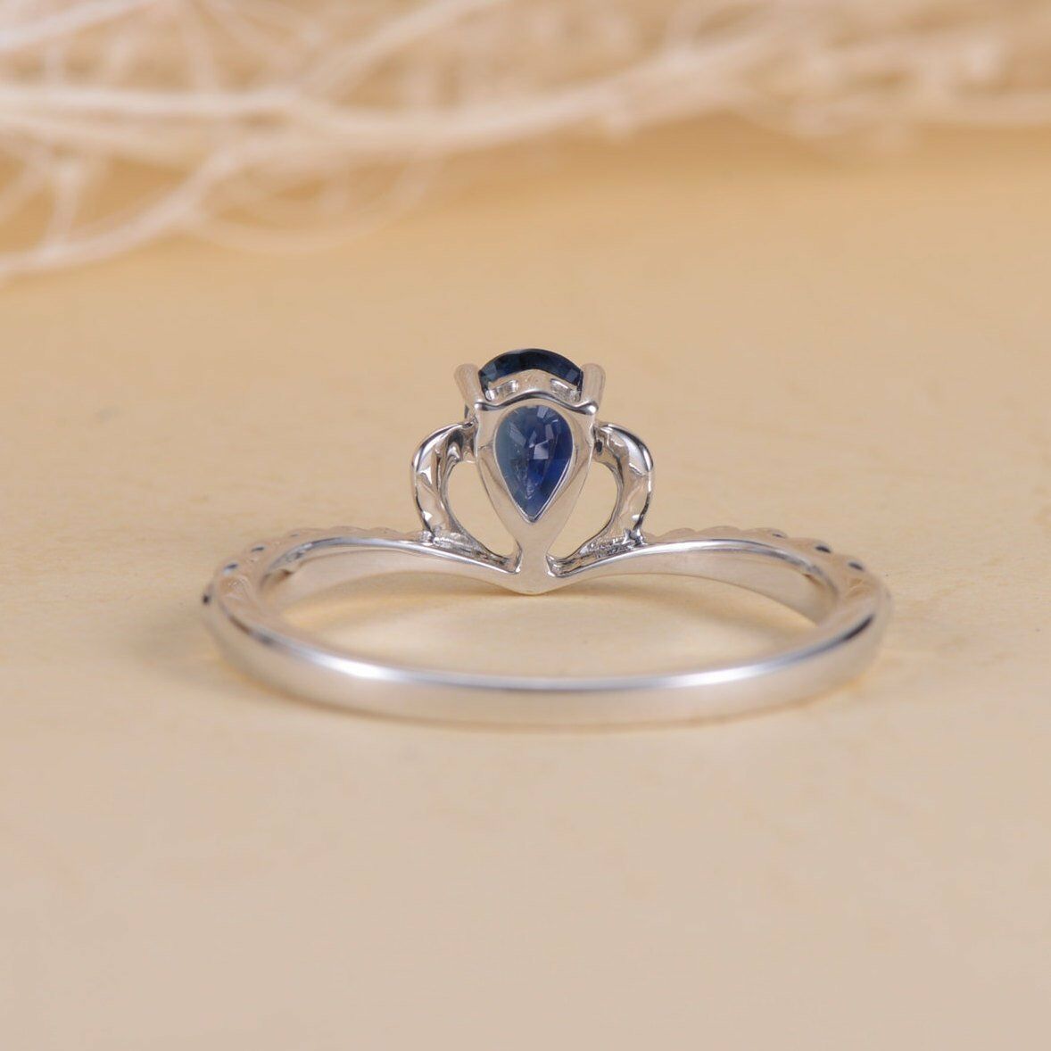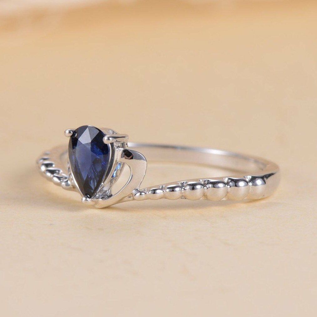 0.5ct Pear Cut Blue Sapphire Engagement Ring 14k White Gold Finish Beaded Crown
