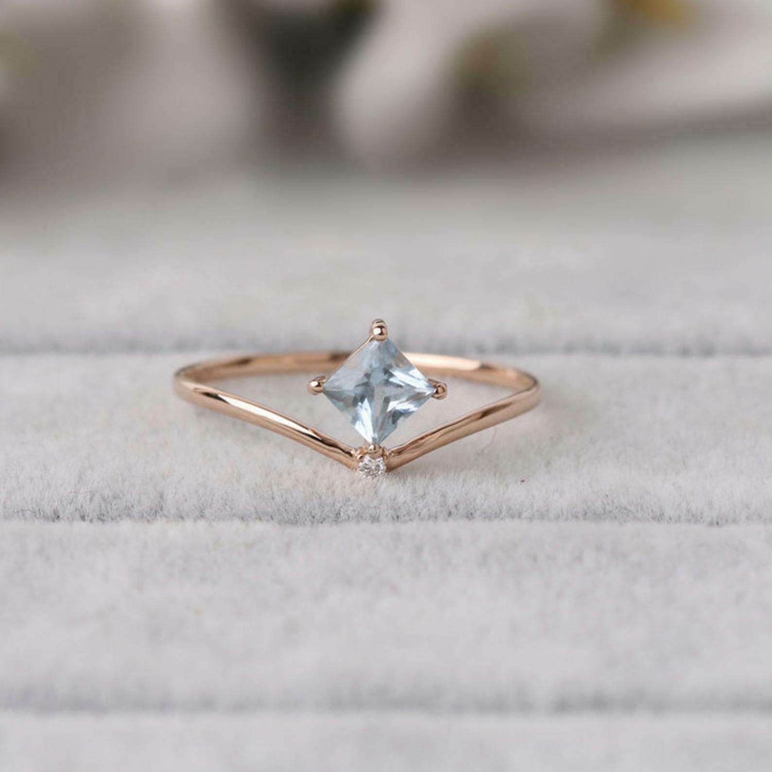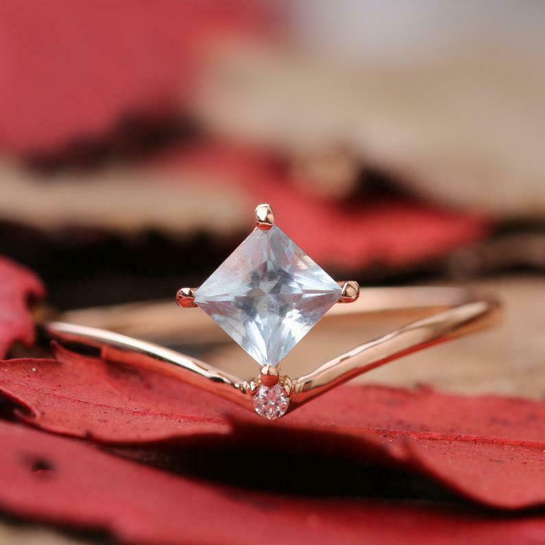 0.5ct Princess Cut Blue Aquamarine Wedding Band V Shape Curved 14k Rose Gold Over