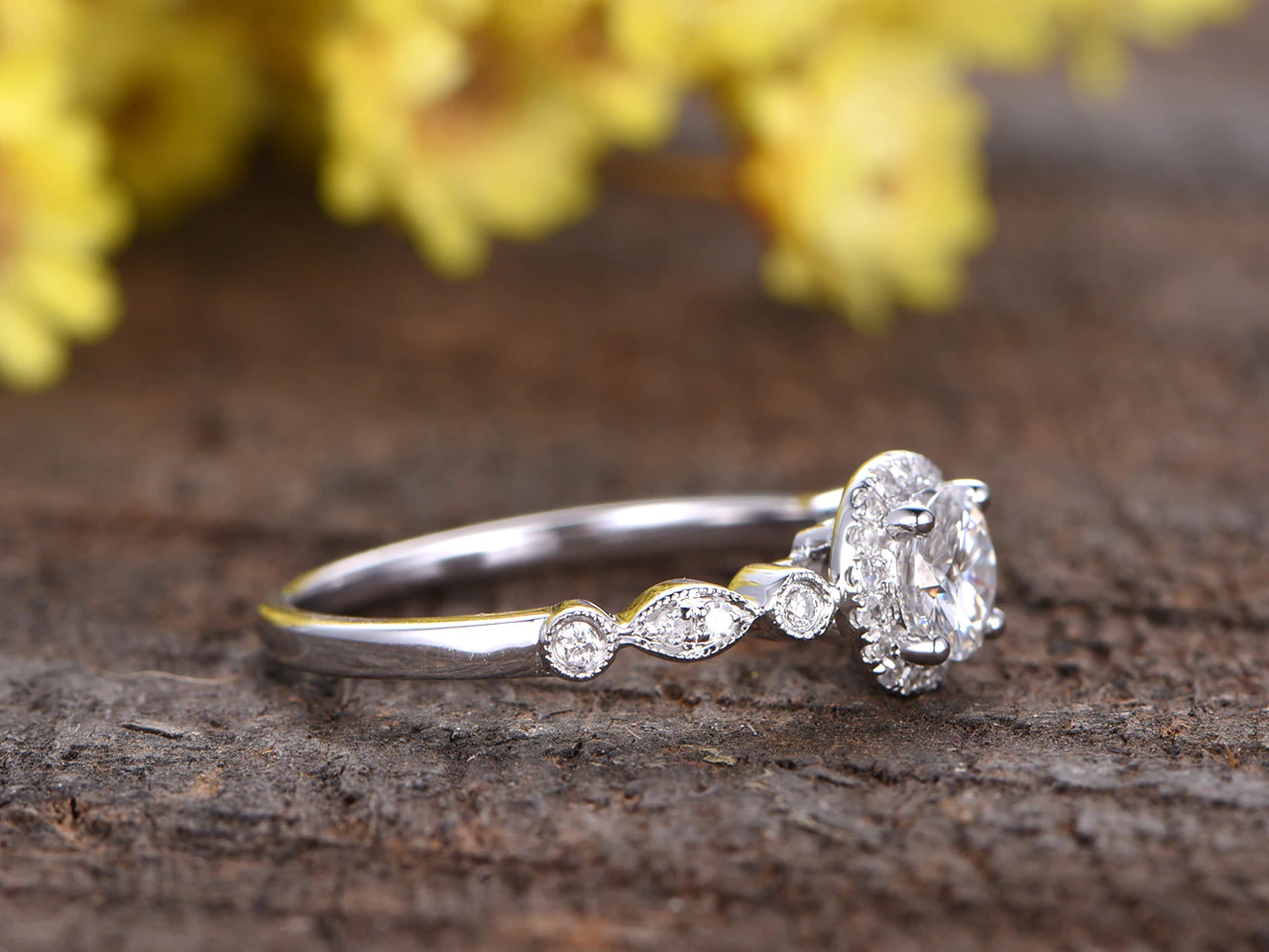 0.5ct Round Cut VVS1 Diamond Engagement Ring 14k White Gold Finish Halo Milgrain