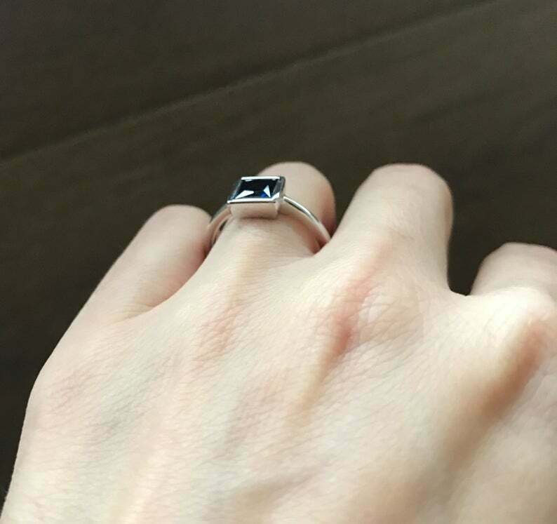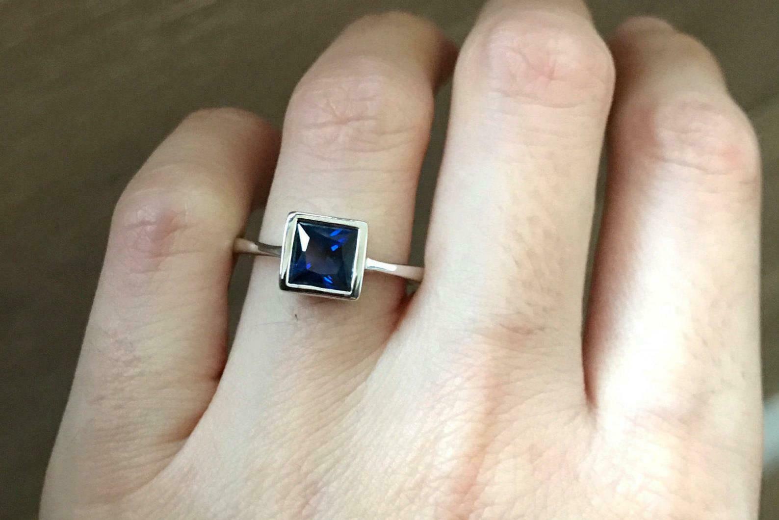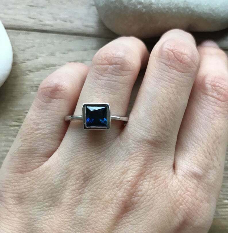 0.6ct Princess Cut Blue Sapphire Engagement Ring Bezel Set 14k White Gold Finish
