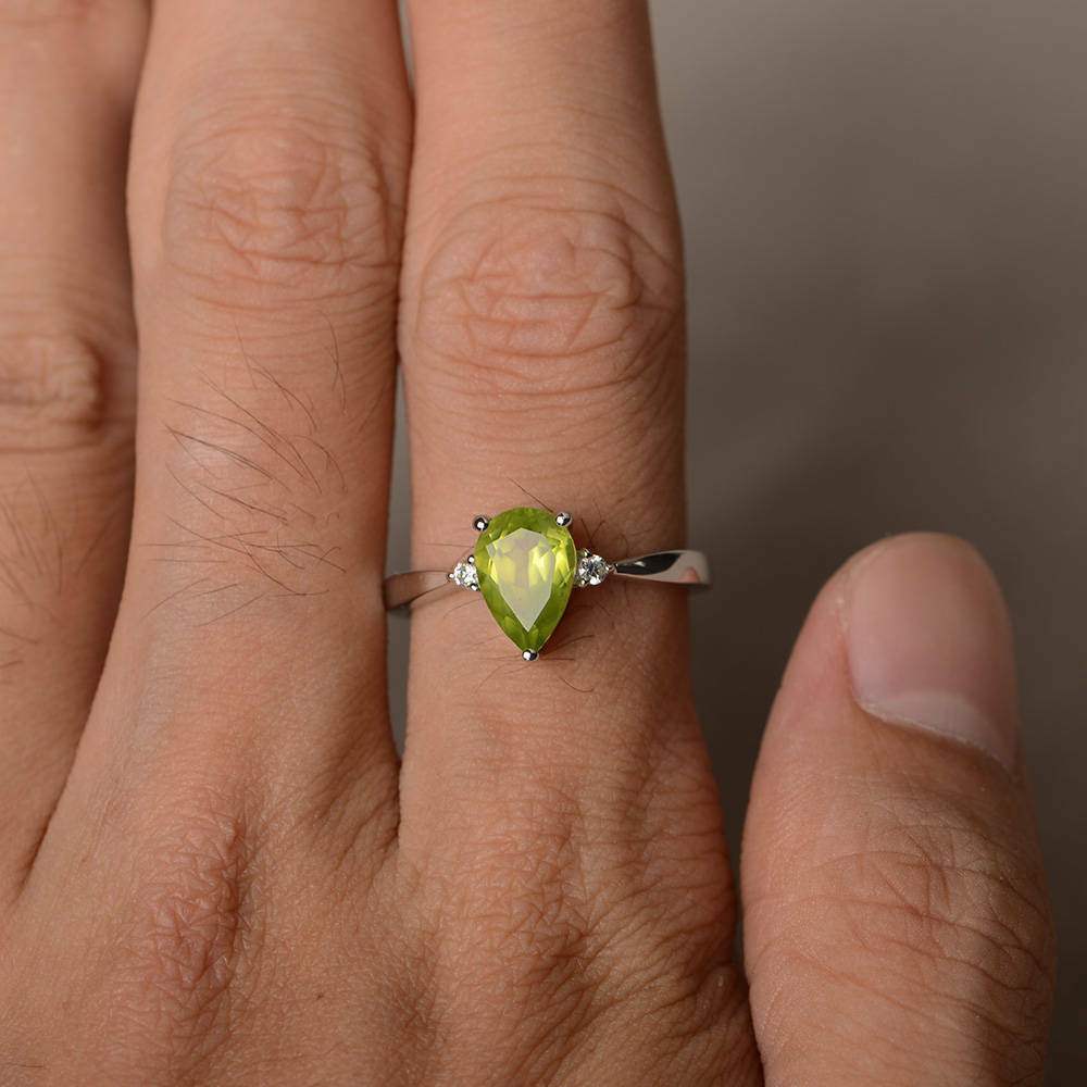 0.75ct Pear Cut Green Peridot Trilogy Engagement Ring 14k White Gold Finish