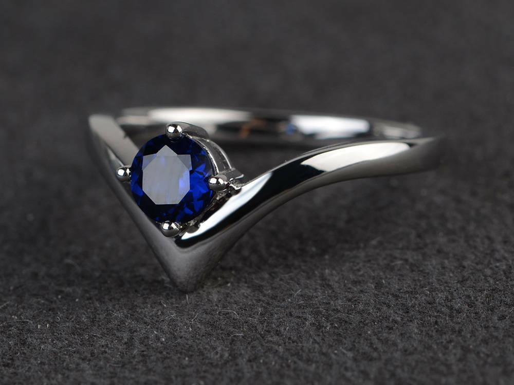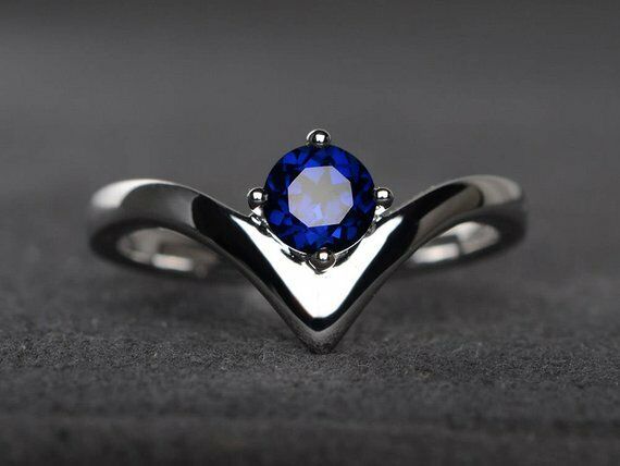 0.7ct Round Blue Sapphire Engagement Ring 14k White Gold Finish Unique V Curved