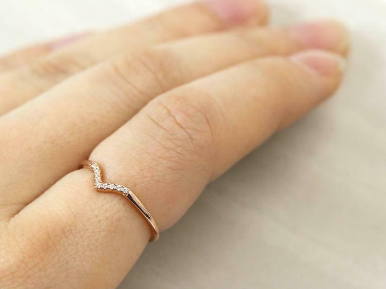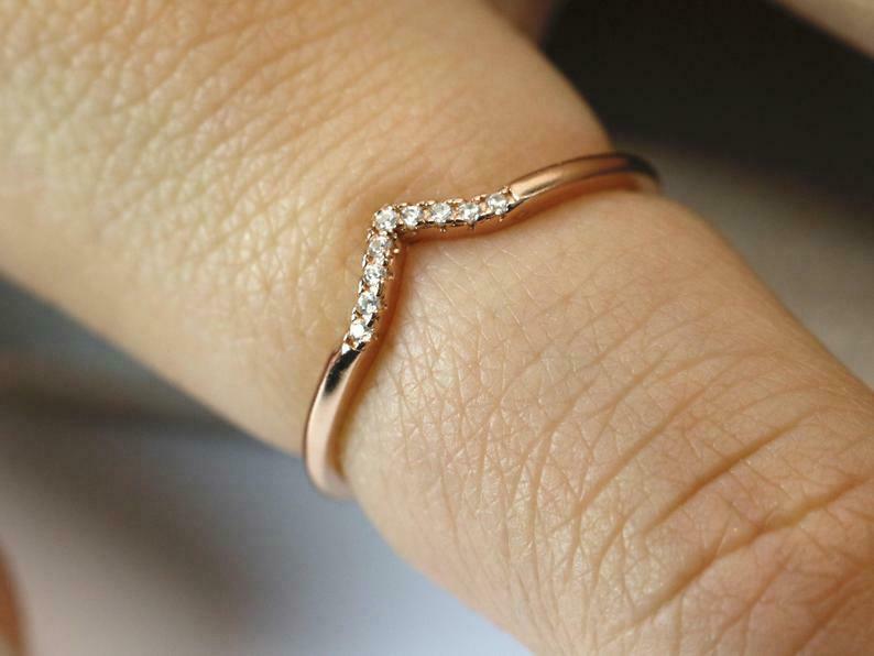 0.8ct Round Cut Diamond Wedding Band V Shaped Petite Curved 14k Rose Gold Finish