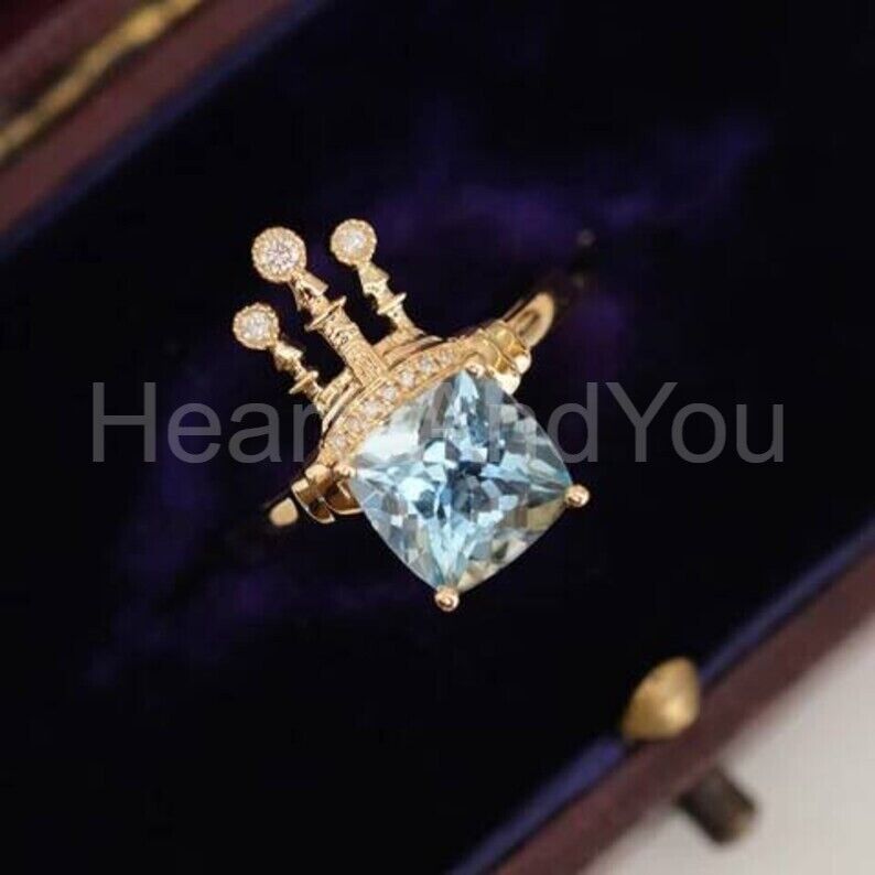 1.1ct Cushion Cut Simulated Aquamarine Royal Queen Castle Ring 14k Gold Plated