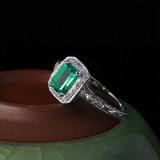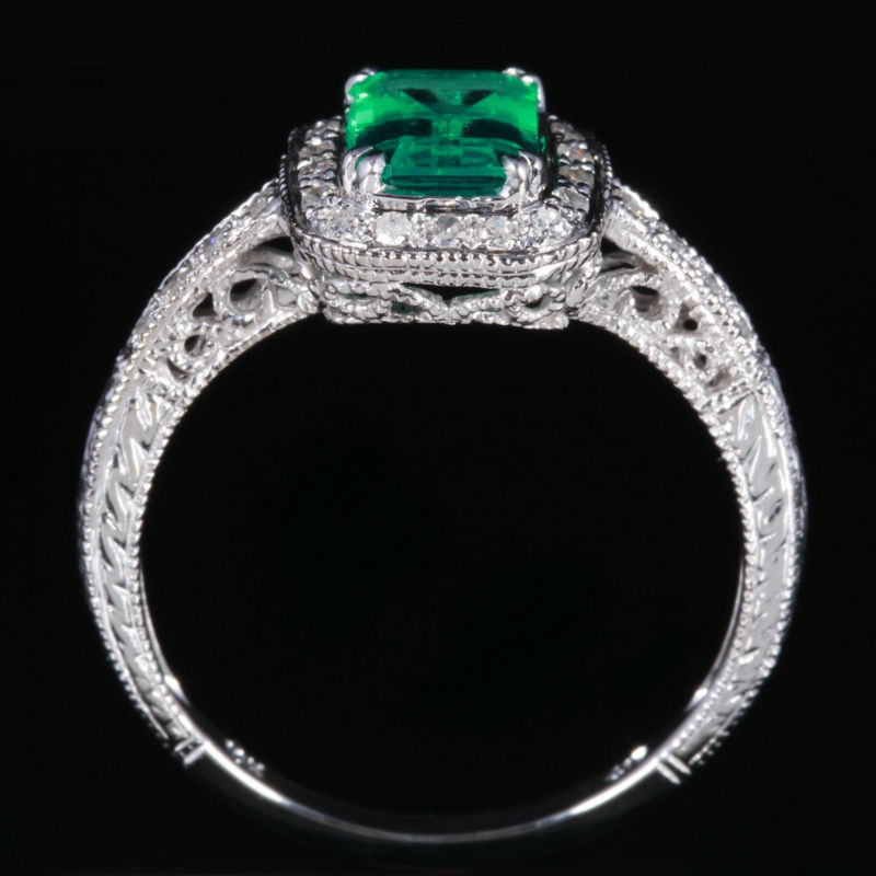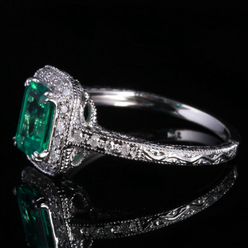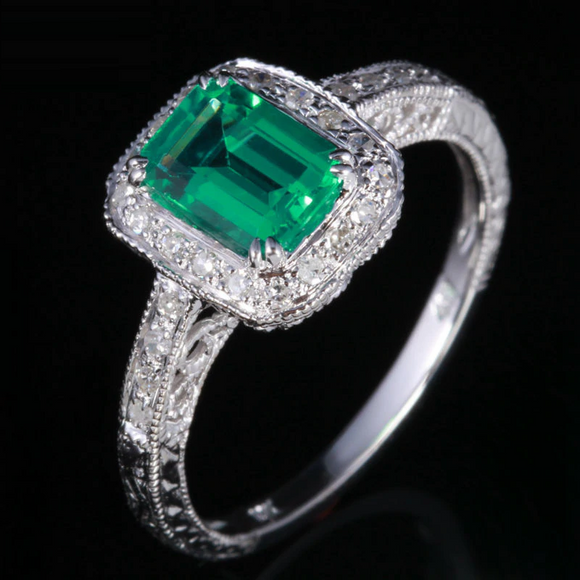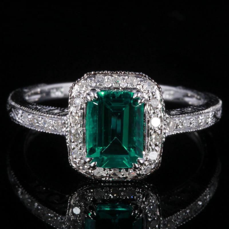 1.2ct Emerald Cut Green Emerald Halo Engagement Ring 14k White Gold Finish