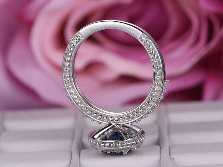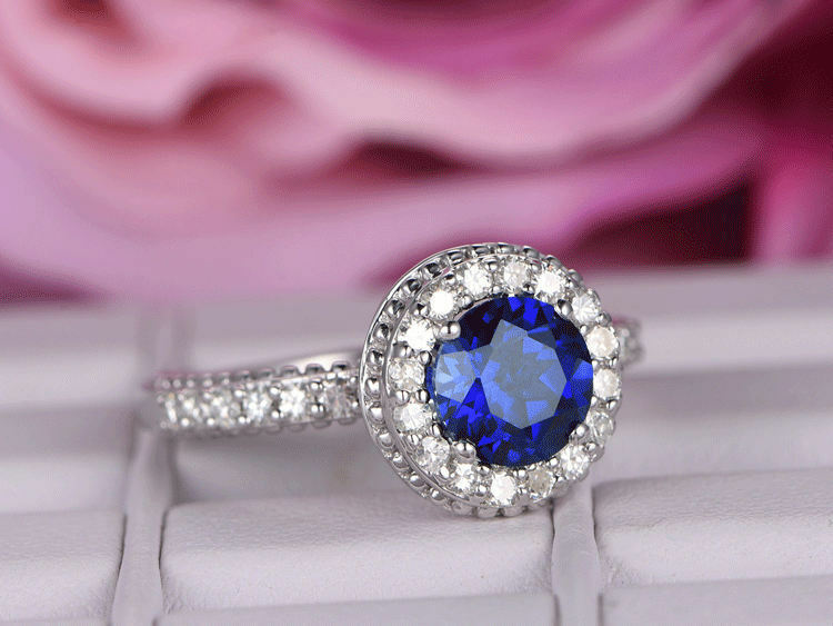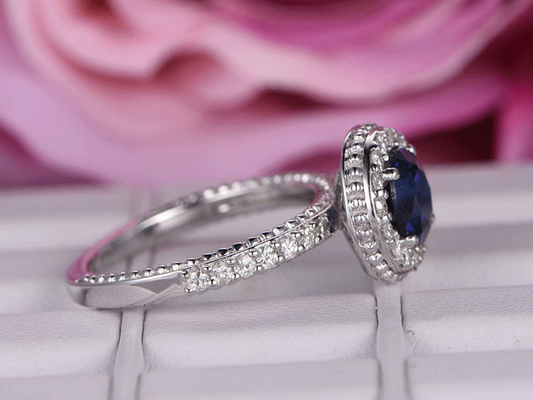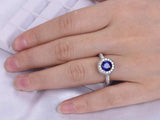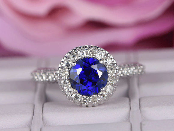 1.2ct Round Cut Blue Sapphire Engagement Ring 14k White Gold Finish Halo Bridal